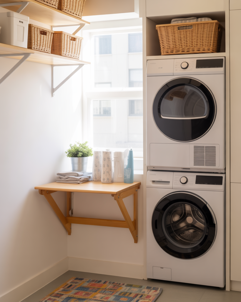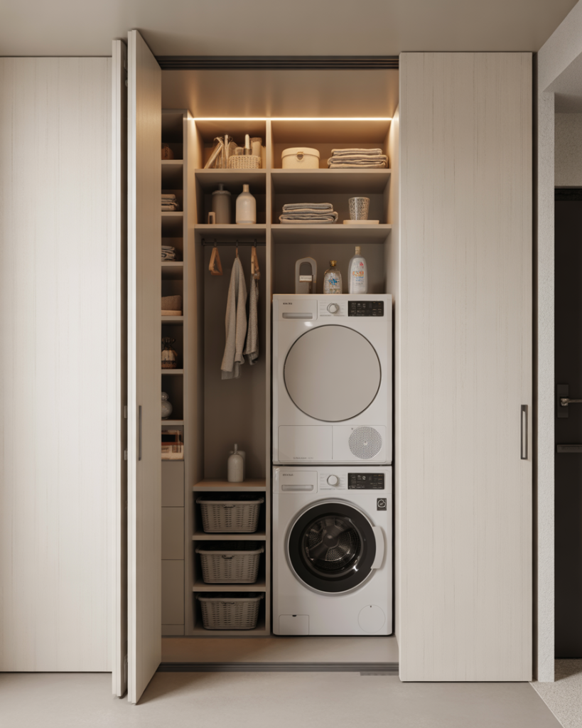 Disguise your laundry area behind sleek sliding panels or folding doors. This design fits tiny city apartments where aesthetics matter as much as function. Pair stackable units with concealed shelving and soundproofing materials for a whisper-quiet experience. It’s the perfect blend of style and subtlety, inspired by modern organization principles.