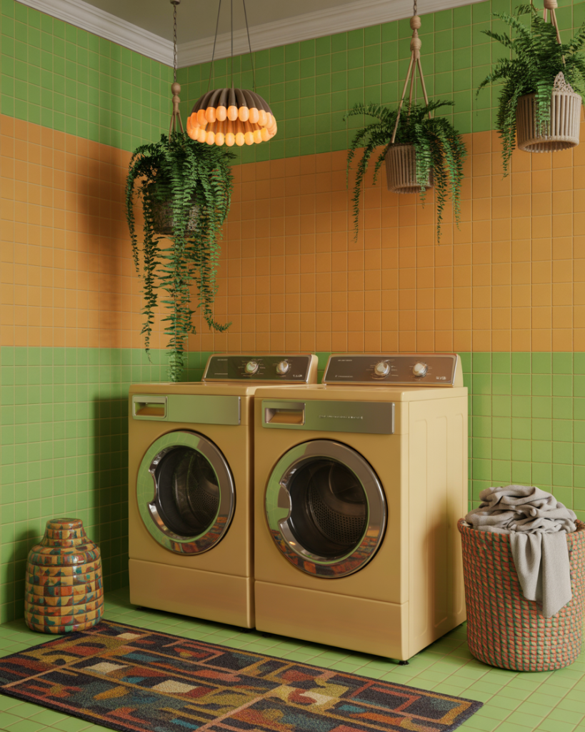 Bring back the joy of color with retro 1970s-inspired design. Colorful tiles, round knobs, and vintage signage create a fun and cheerful environment. A bright top-load washer or mint-green front loader adds nostalgia. This is laundry with personality—full of character and creativity.