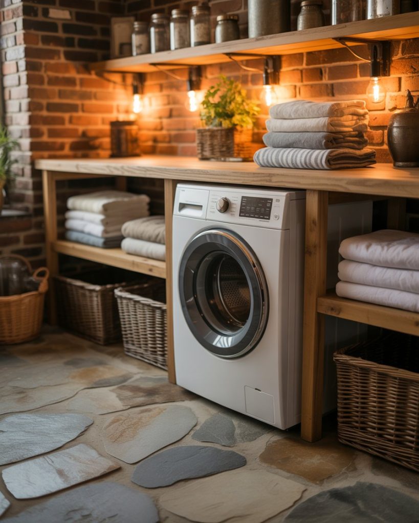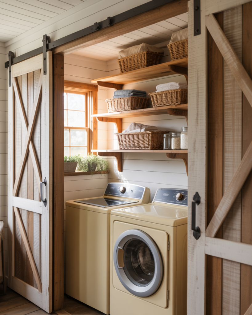 A rustic laundry room never goes out of style. Think natural wood shelves, vintage jars, and a top loader layout surrounded by white shiplap walls. Woven baskets and barn doors give it personality while remaining functional. This look fits perfectly in a country home or renovated basement where texture and warmth matter most.