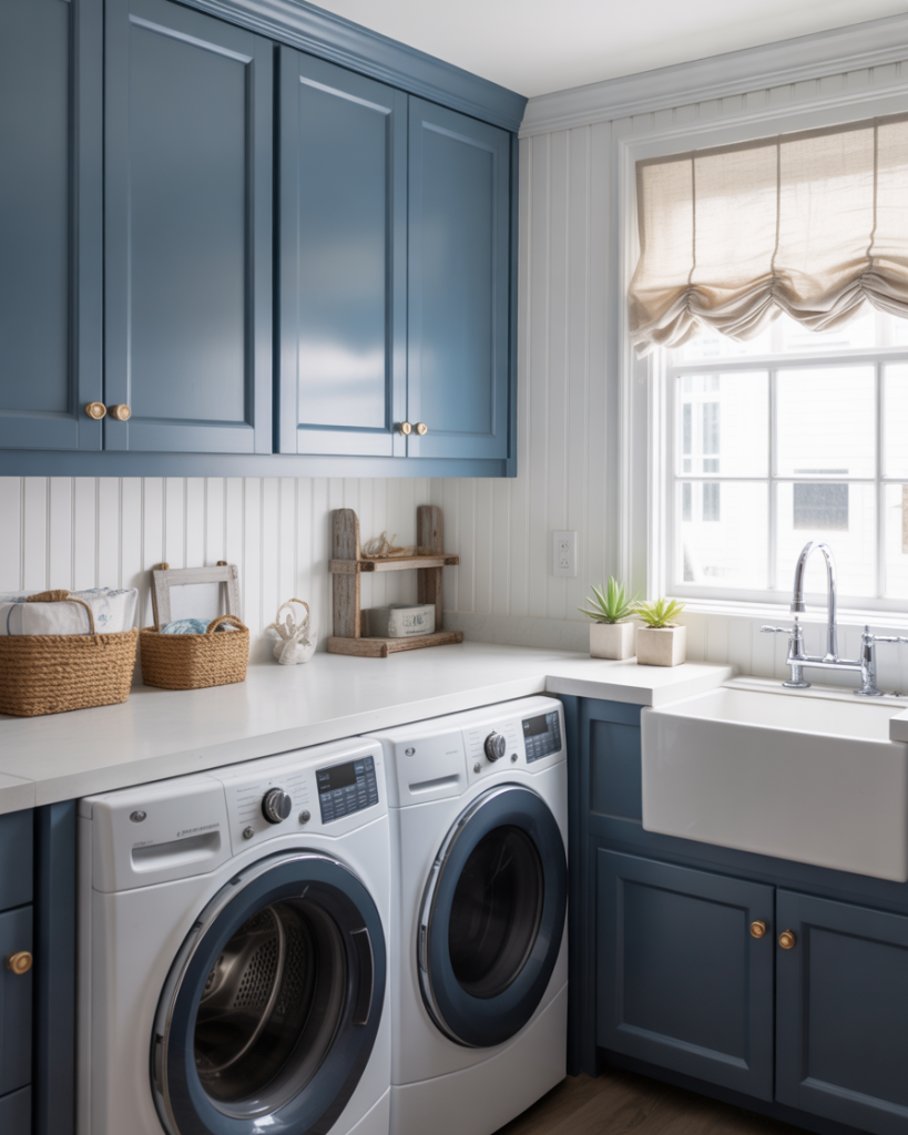 Capture the light, airy feeling of the seaside in your laundry design. Choose pale blues, driftwood accents, and white beadboard walls. A front loader or stackable setup fits perfectly in this small, narrow concept. This coastal style is refreshing, ideal for homes near water or anyone dreaming of beach tranquility.