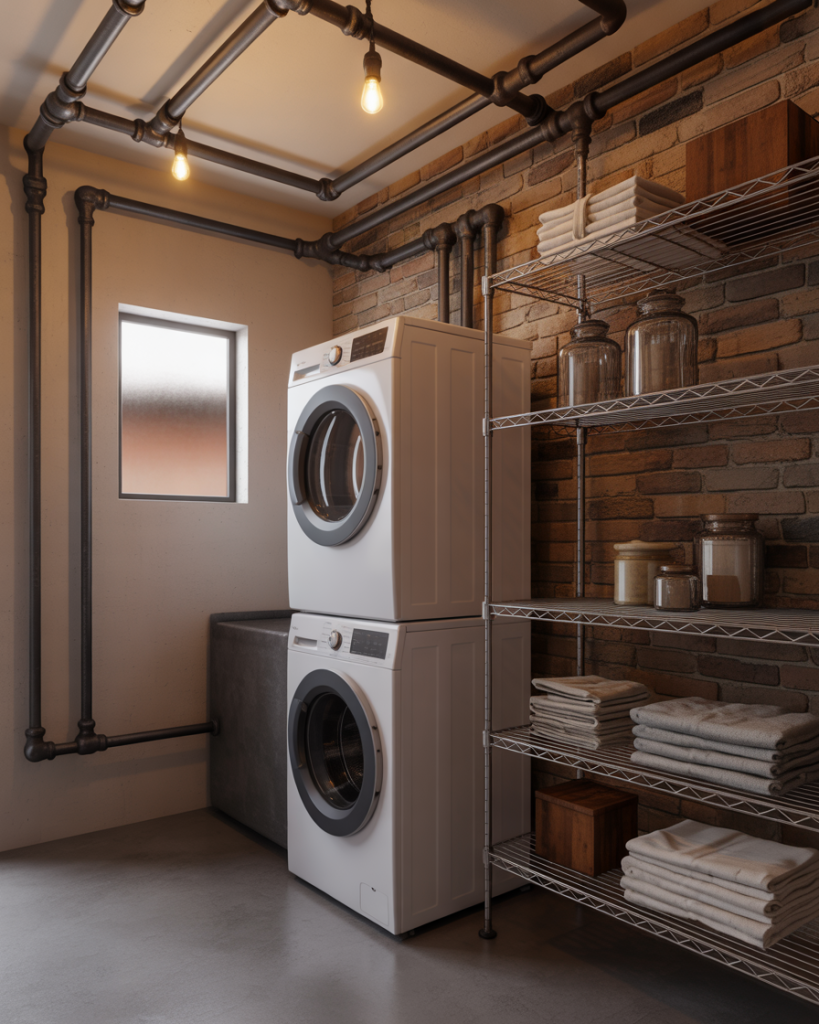 Go bold with exposed pipes, metal shelving, and cement floors. The rustic yet modern aesthetic fits perfectly in lofts or converted garage spaces. Use a stacked washer-dryer beside open shelves for practicality. A dark backdrop enhances the raw industrial vibe that’s increasingly popular in urban design.