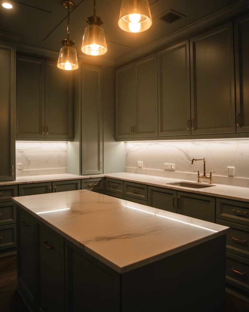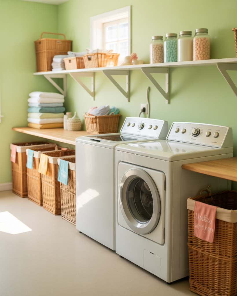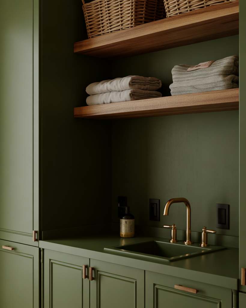 For a sophisticated yet nature-inspired touch, paint your laundry in moody sage or forest tones. Pair with gold hardware, stone countertops, and wood shelving. This dark-but-serene palette feels both grounding and elegant. It works beautifully for narrow or enclosed spaces where atmosphere matters most.