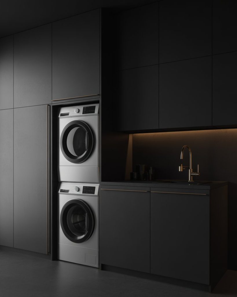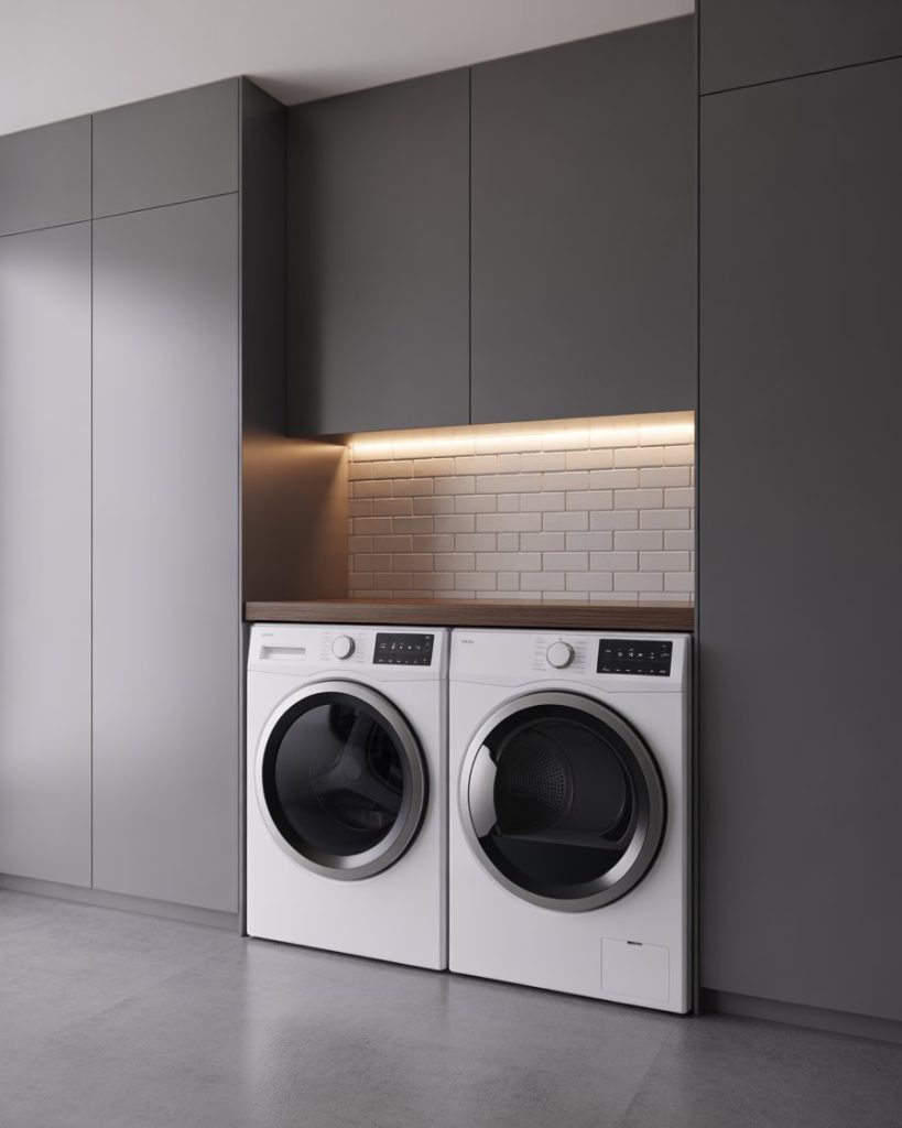A dark, moody palette adds drama and calm to your laundry space. Use matte black, navy, or deep gray for walls and pair them with metallic handles or warm brass. A stackable washer and dryer fit perfectly into this clean aesthetic. The look feels sophisticated yet serene—design minimalism at its best, praised by designers like Kelly Wearstler.