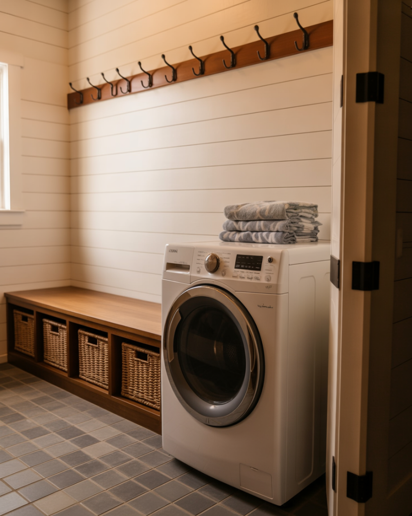 Merging your laundry with a mudroom is practical and stylish. This layout works beautifully with a top-load washer or sleek front loader, plus coat hooks and bench storage. Durable tile and built-in cubbies make it easy to manage muddy boots and dripping jackets. As Joanna Gaines often says, multifunctional spaces are the heart of modern homes—and this combo is proof.