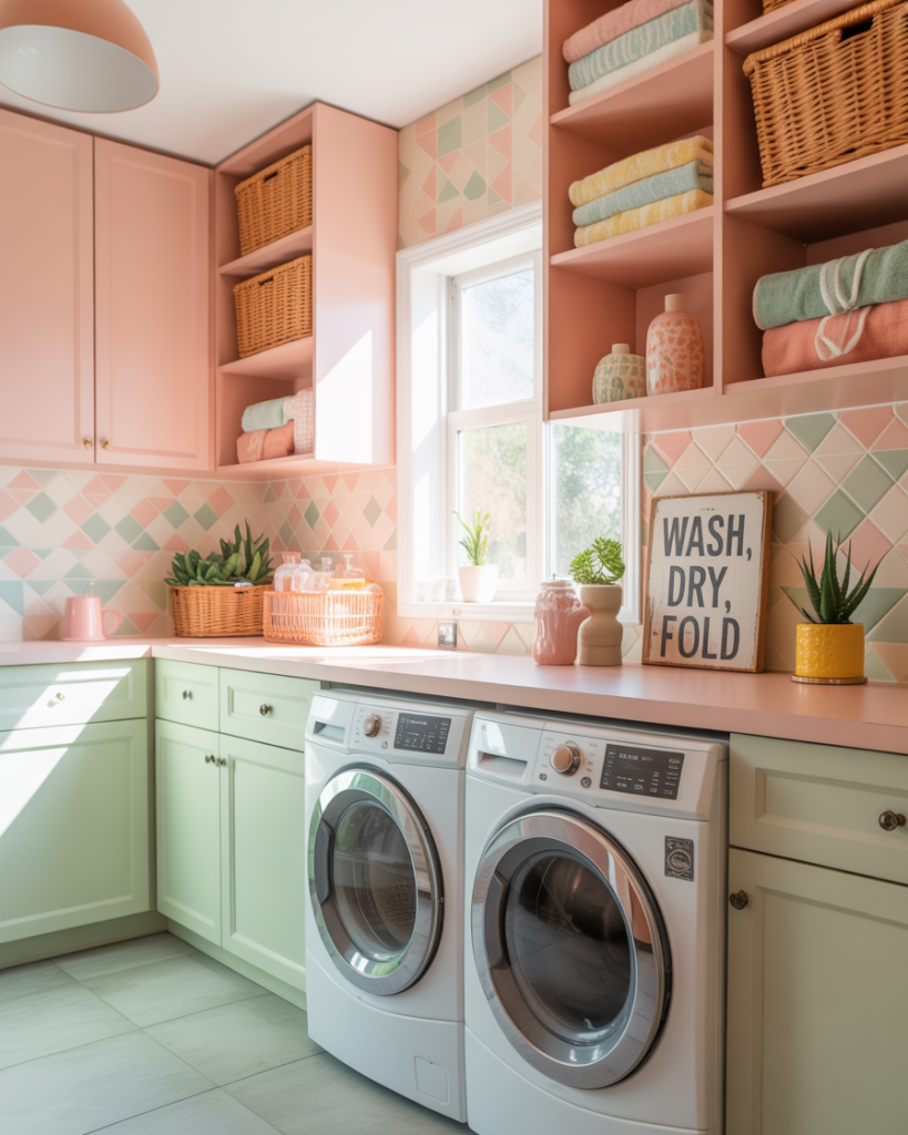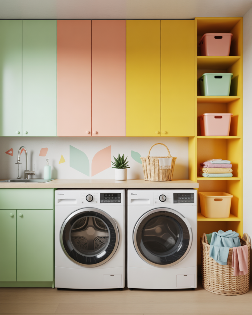 Brighten the mood with a colorful laundry space. Vivid cabinetry, patterned tiles, or pastel hues create energy, especially in a small narrow area. Try coral, mint, or yellow tones inspired by playful design worlds like Toca Boca. Pair with open shelving for baskets and detergents to maintain organization without sacrificing fun.