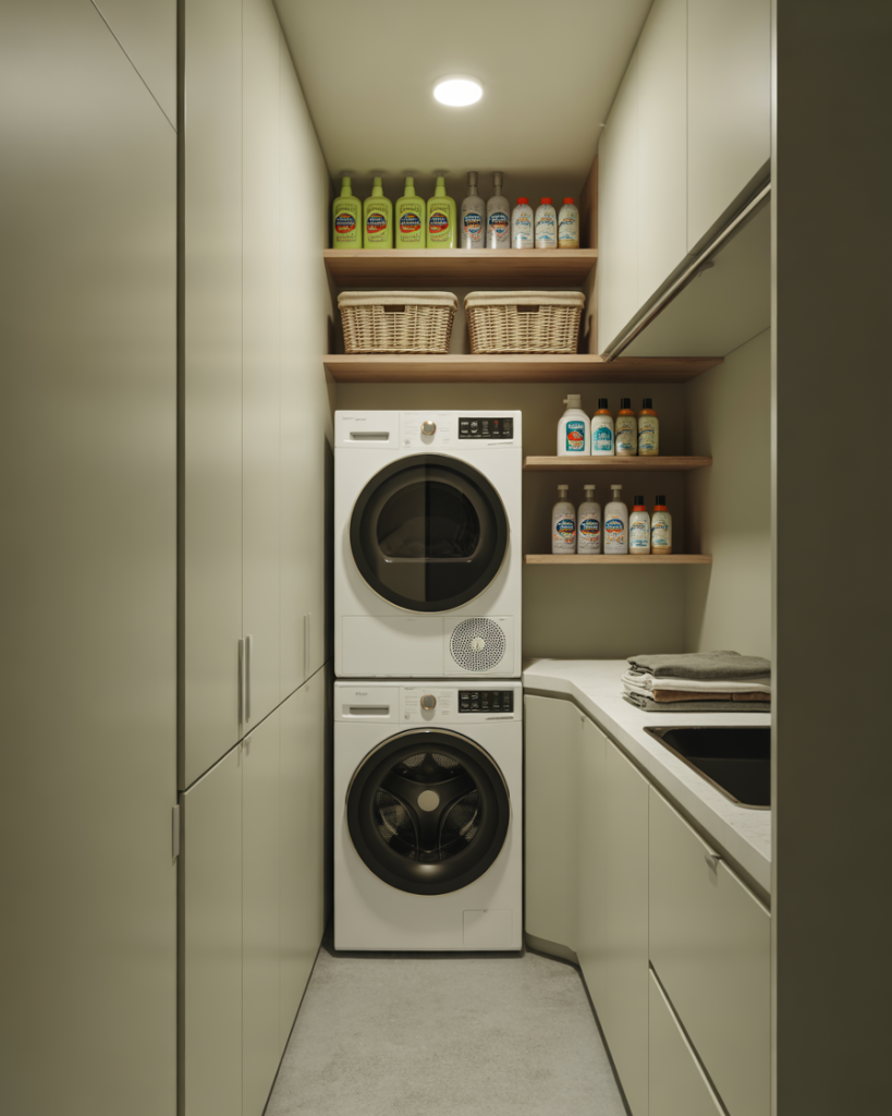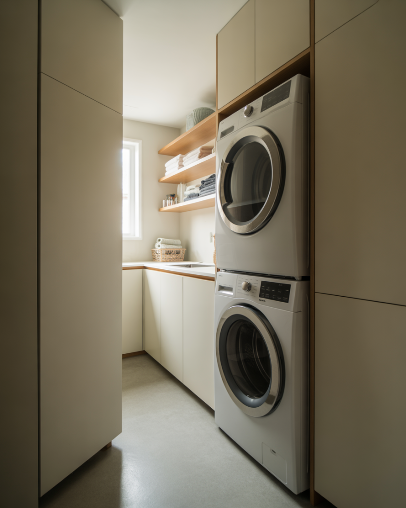 If your laundry area is narrow, use a galley-style design. Place your stacked washer and dryer or front loader along one wall and keep the opposite side open with floating shelves and slim cabinets. The small, narrow design keeps movement easy and everything within reach. Add under-cabinet lighting and a drying rail to make the most of every inch.