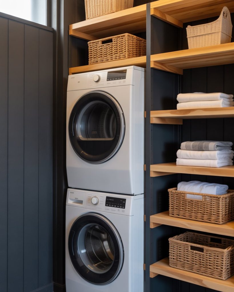 Mix dark cabinets with organic textures for a modern yet cozy effect. Combine a stacked washer dryer with natural wood shelving and woven baskets for balance. The contrast between shadowy tones and warm materials creates a sense of depth. Designers on Apartment Therapy note this “soft industrial” trend as a defining 2026 aesthetic.