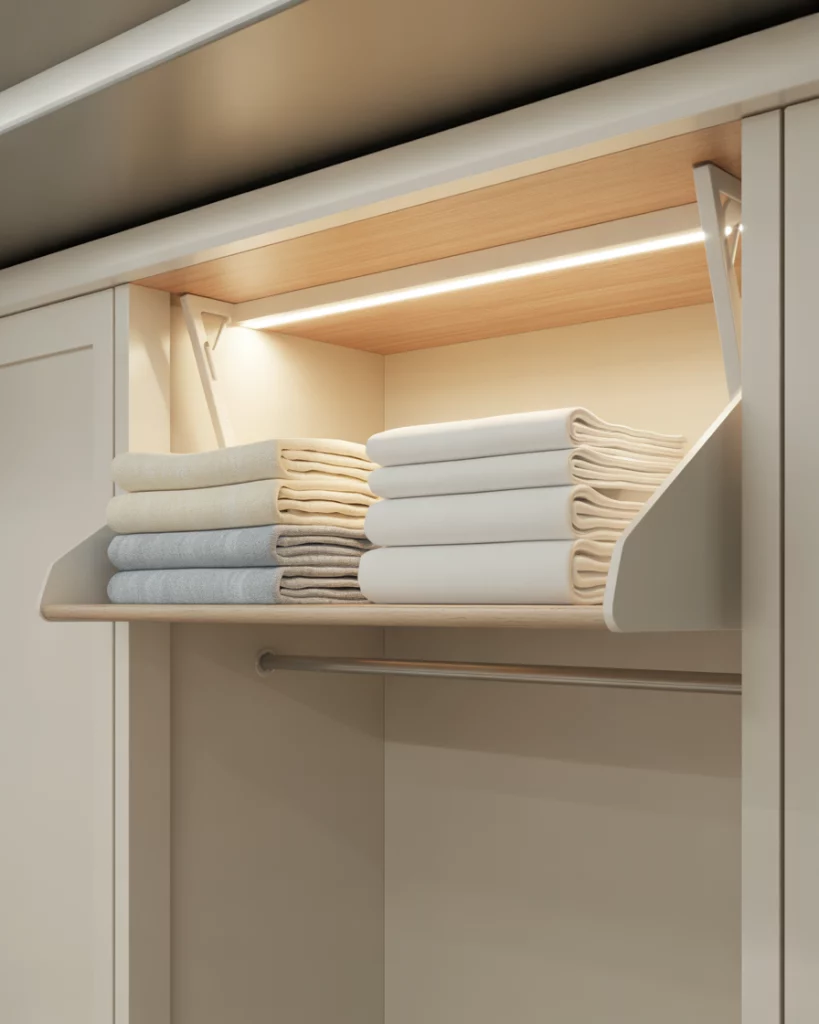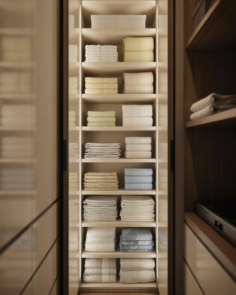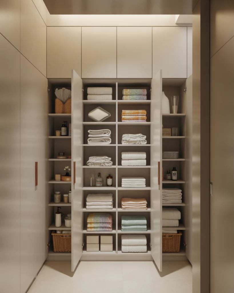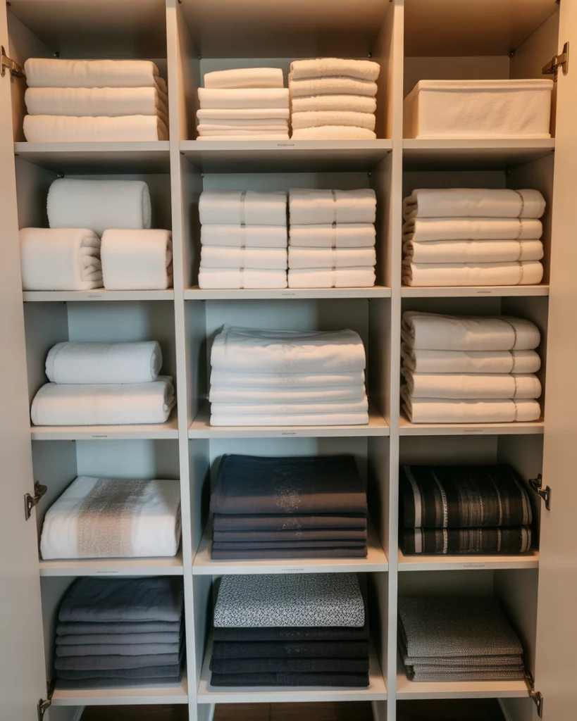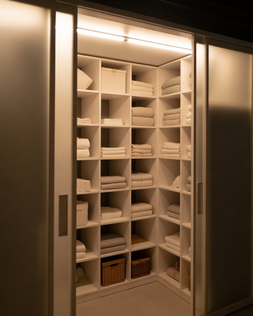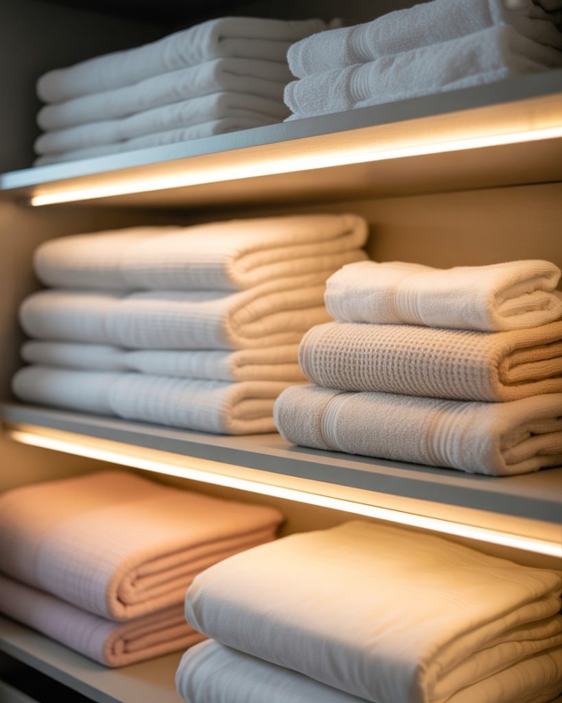 Install LED strips under each shelf for a backlit glow. This not only enhances the aesthetic but also helps locate towels and sheets easily in a deep shelf or walk-in closet. It’s an upscale touch for 2026 interiors.