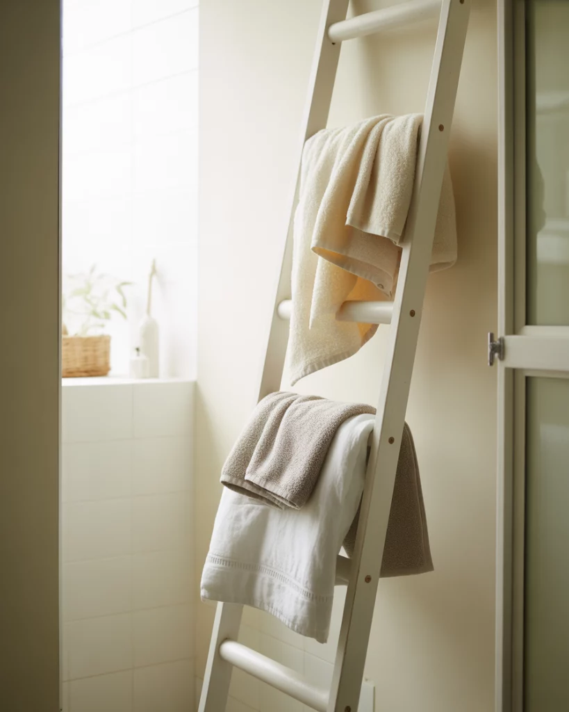 A compact rolling ladder shelf makes a clever alternative for tiny or open bathroom layouts. Stack towels on the rungs, fold sheets on the top shelf, and enjoy mobility that suits ideas for small spaces and flexible design.
