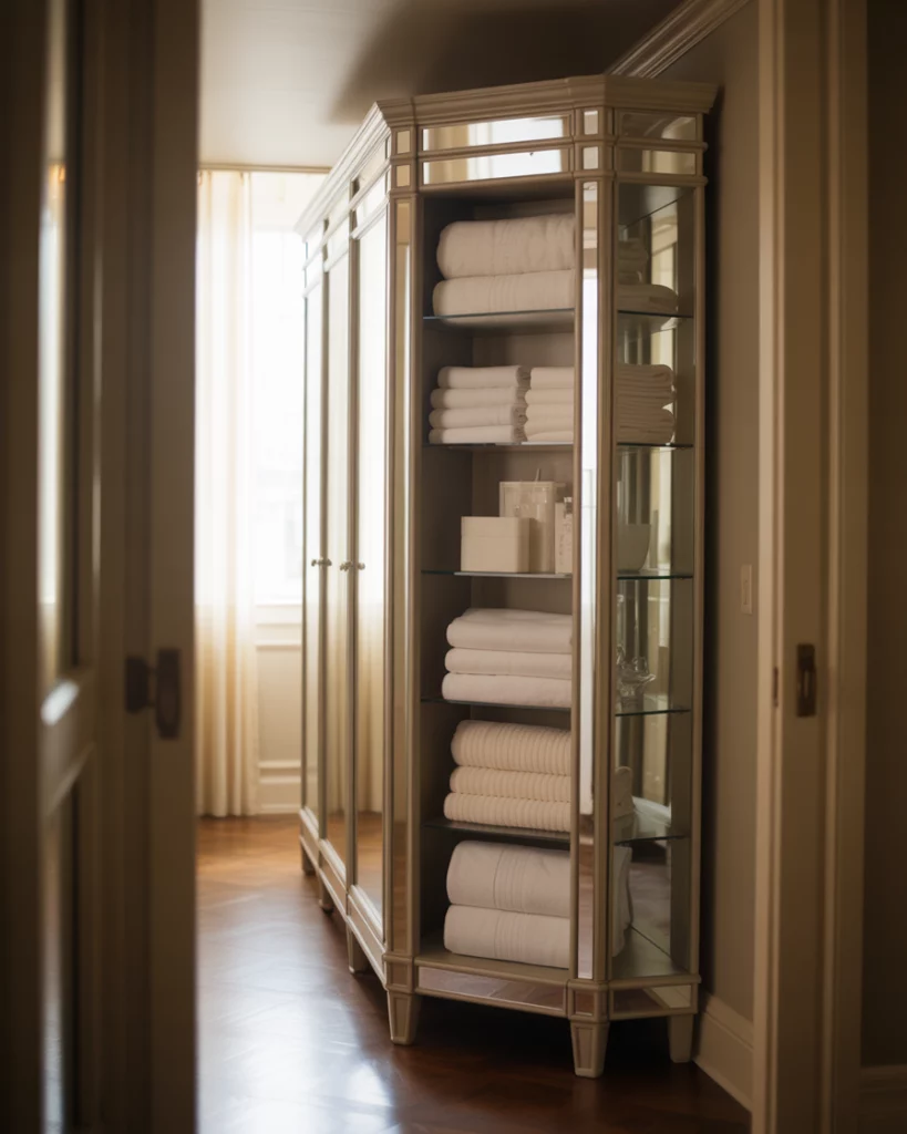 For narrow or hall closets, a mirrored cabinet offers dual benefits—storage and reflection. It helps small areas appear larger while hiding towels and sheets neatly inside. A favorite among hallway ideas for 2026’s minimalist interiors.