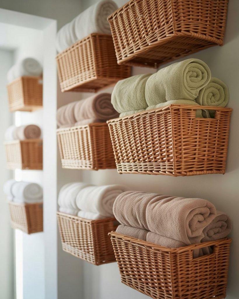 Turn your hall or open bathroom wall into storage art using wicker baskets hung securely. Roll towels inside and stack sheets in a few. It’s one of the coziest hallway design ideas, perfect for farmhouse or boho homes.