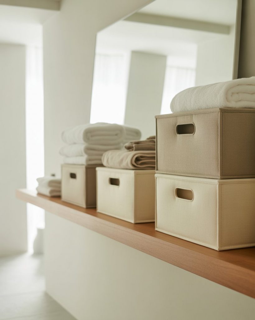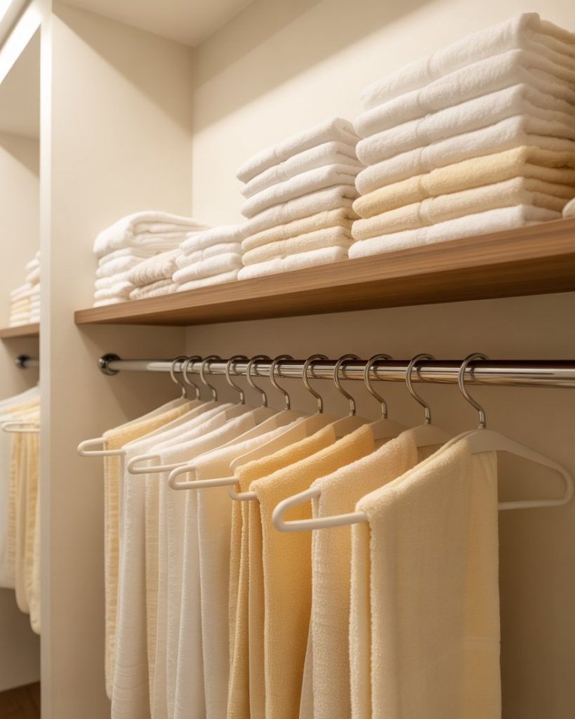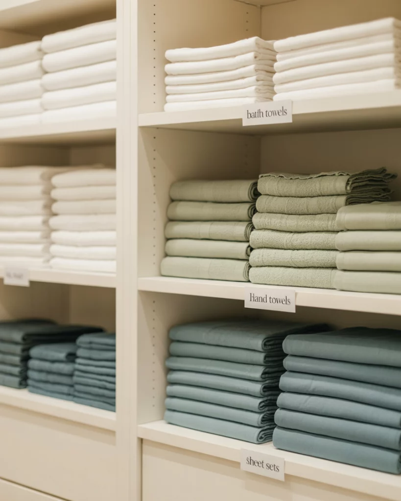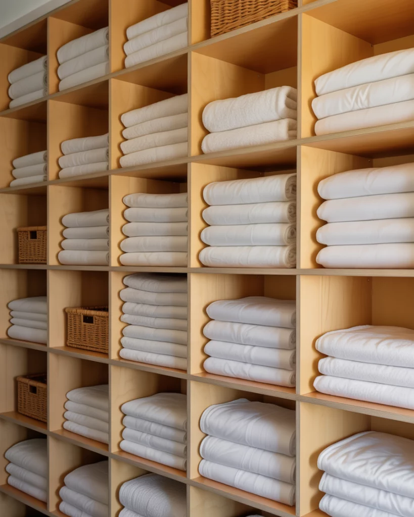 Create color zones for each category—bathroom linens on white shelves, hallway linens on natural wood. This aesthetic distinction keeps organization intuitive and adds warmth. It’s ideal for open shelving where you want a cohesive look.