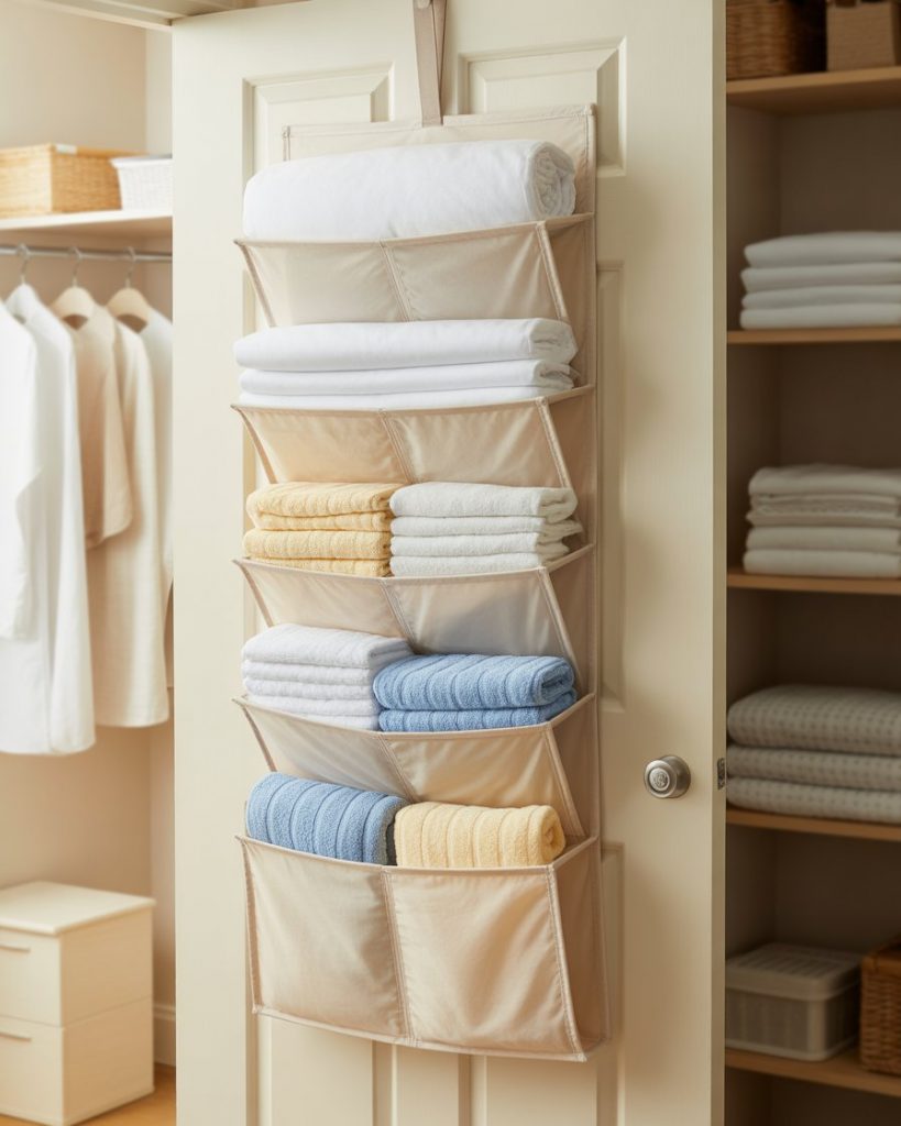 Maximize hallway or bathroom doors with hanging organizers that hold rolled towels, toiletries, or accessories. It’s an affordable Dollar Tree-friendly solution for small hallway spaces.