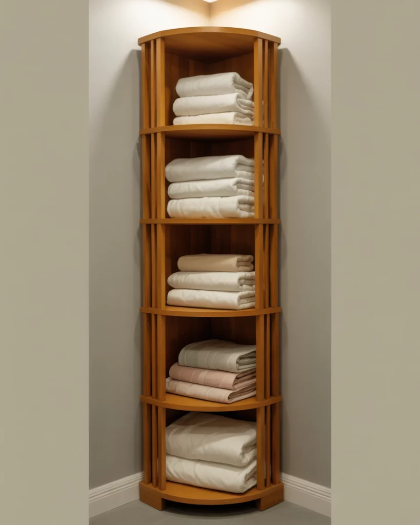 A rotating vertical tower shelf adds motion and fun to tiny or open linen closets. Each side can hold towels, sheets, or accessories, making use of awkward corners in bathroom or hallway designs.