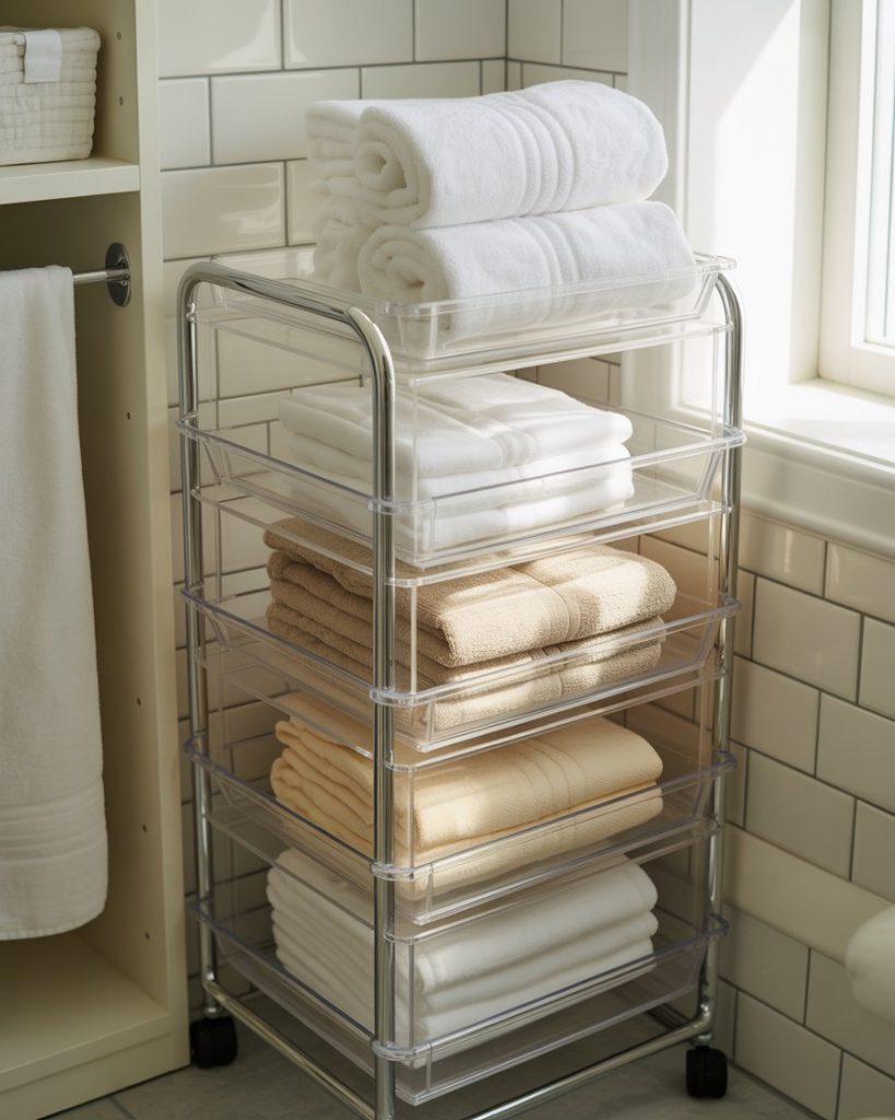 In a tiny home or open bathroom, clear acrylic bins on a rolling cart are a flexible storage option. Great for ideas for small hallways or ideas for small spaces, they let you see what you own while staying easy to move and clean.
