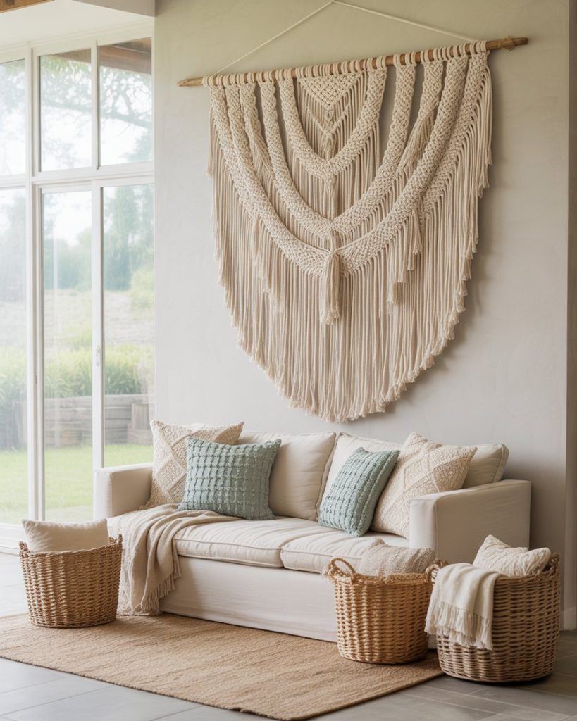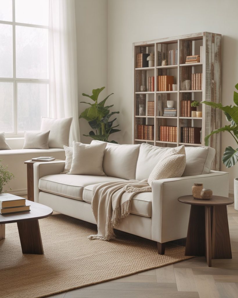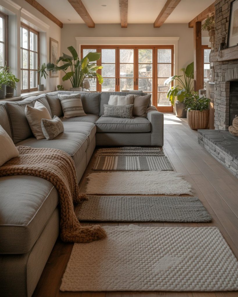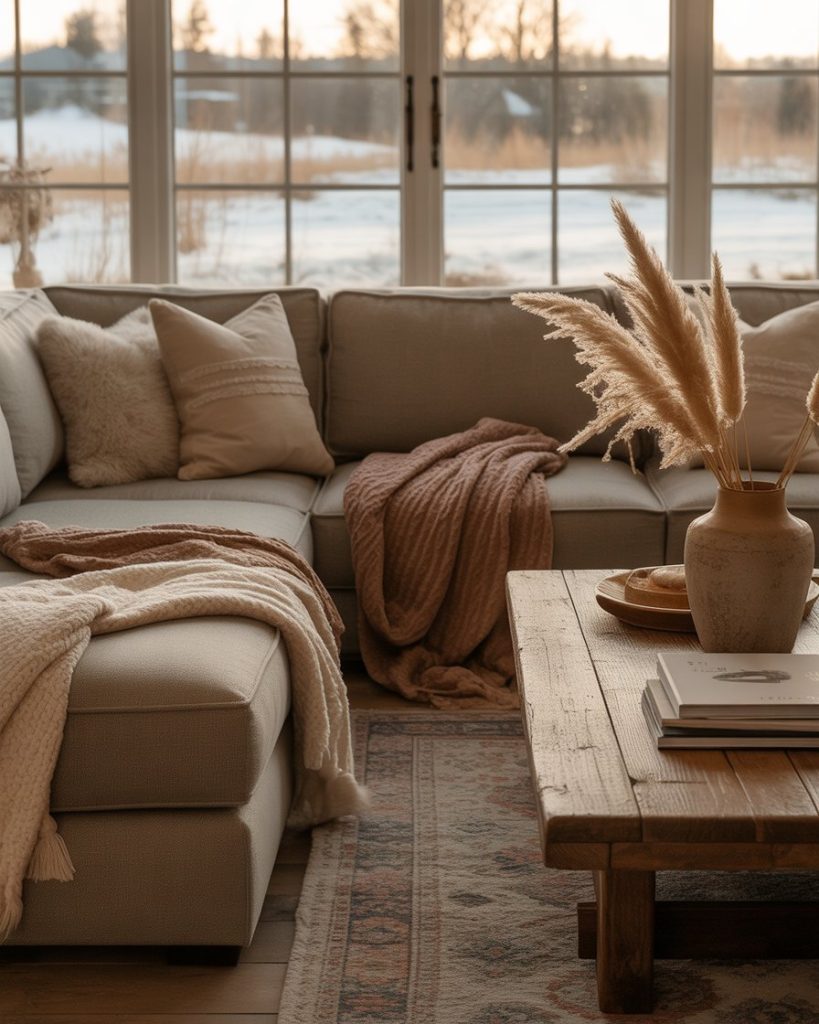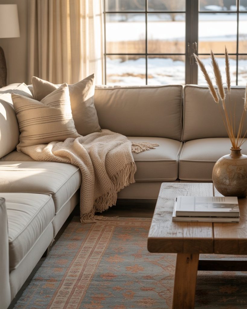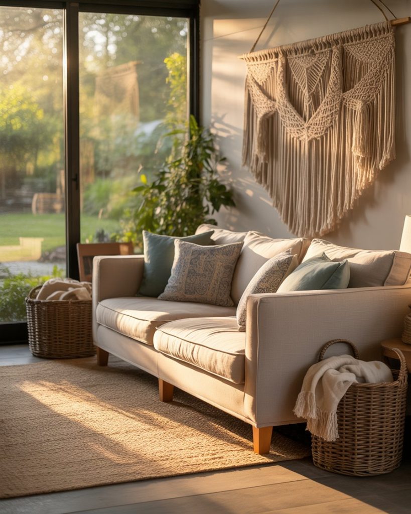 A grey couch continues to gain popularity in 2026 for its versatility. Style it with boho pillows and knit throws while layering in a soft rug. Organic wooden side tables or pottery add a touch of warmth. This base works with nearly any paint color-from earthy brown to coastal blue.