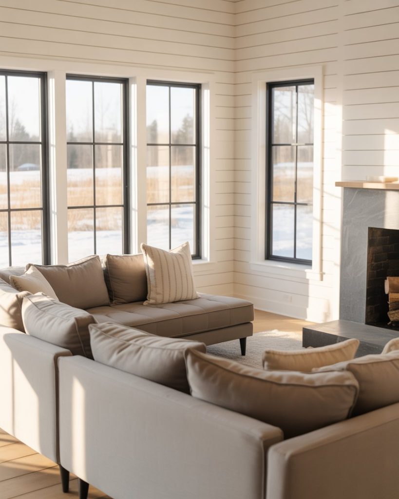 The black frames added to windows create a graphic statement. They outline the white shiplap, flooding the room with definition. Soft linen drapes and a grey couch keep it light-hearted. This juxtaposition of light and dark is classy yet unpretentiously farmhouse.