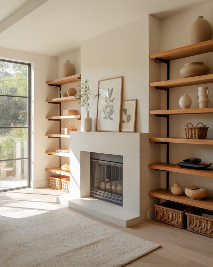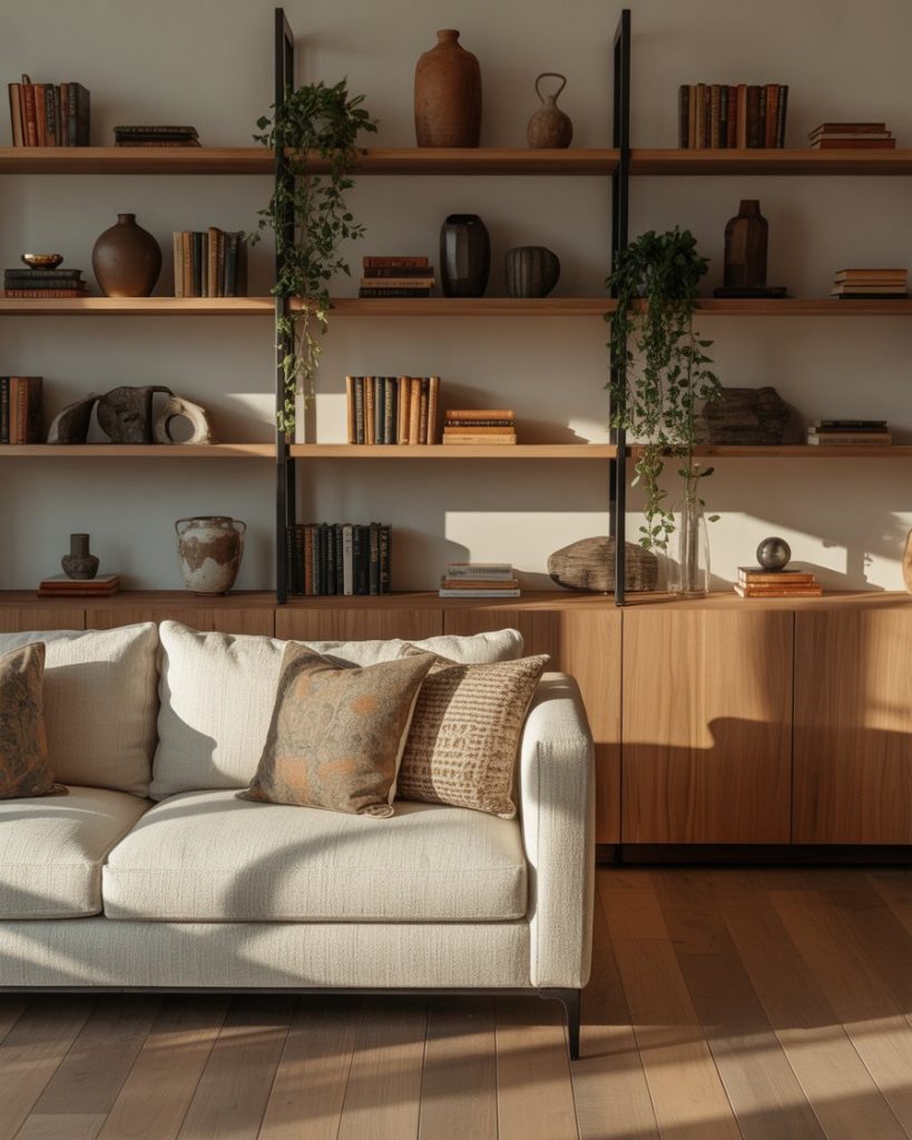 Floating shelves in reclaimed wood double as wall decor and storage. Figure out how to arrange pottery, baskets, and framed art to tell your story. The black brackets and rustic finishes keep things grounded, while a few green plants help the display feel alive and connected to nature.