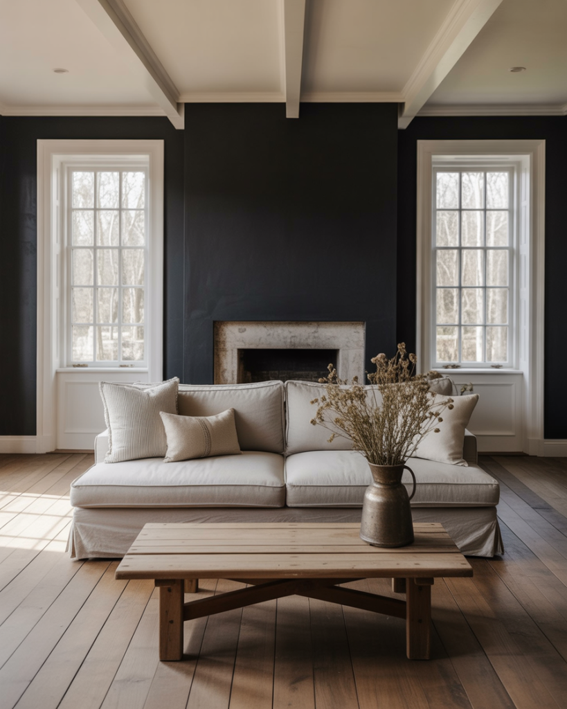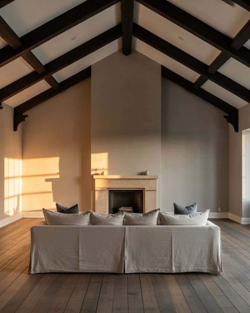 A luminous ceiling can totally alter the mood. Deep navy, charcoal, and espresso are all good choices if the intention is to create that feeling of intimacy and to contrast the lighter white or beige walls. Exposed beams or black trims reinforce the farmhouse structure and add a layer of depth to the otherwise open layouts.