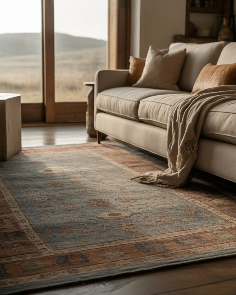 A patterned boho rug brings character and comfort to any neutral farmhouse setting. Choose worn blue or terracotta tones to make the space feel warm. Layering these rugs adds to charm and defines spaces within your layout-a very simple way to bring in warmth and texture.