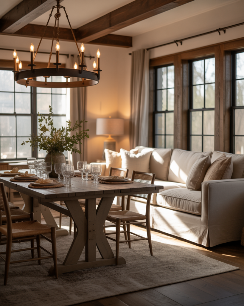 Farmhouse style is not meant solely for big houses. In an apartment, go for lighter furniture, smaller rugs, and storage that saves space. A slender console or foldaway table crafted from reclaimed wood holds fast to the rustic finish while remaining functional. Keep the palette neutral with splashes of black and white to keep it balanced.
