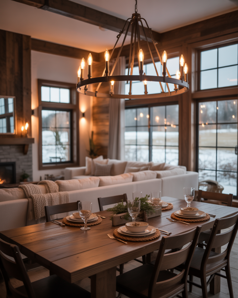 Lighting defines the mood. Pick wrought-iron chandeliers, black lantern pendants, and Edison bulbs for inspiration and a nostalgic feel. Layer these with table lamps next to the brown couch, which casts a warm glow upon your textures and wall decor. The numerous light sources serve both purposes.