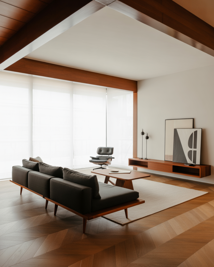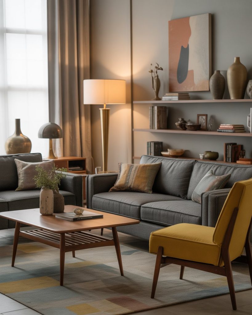 The minimalist mid-century trend is all about clean lines and warm simplicity. Low-profile sofas with wooden legs, sculptural lounge chairs, and uncluttered layouts make small or large spaces feel balanced and sophisticated. The palette stays neutral — white, taupe, or soft black — creating calm and focus. A teak console or vintage lamp adds personality without disrupting the minimalist harmony. Perfect for small spaces, this style is elegant yet grounded in everyday living.