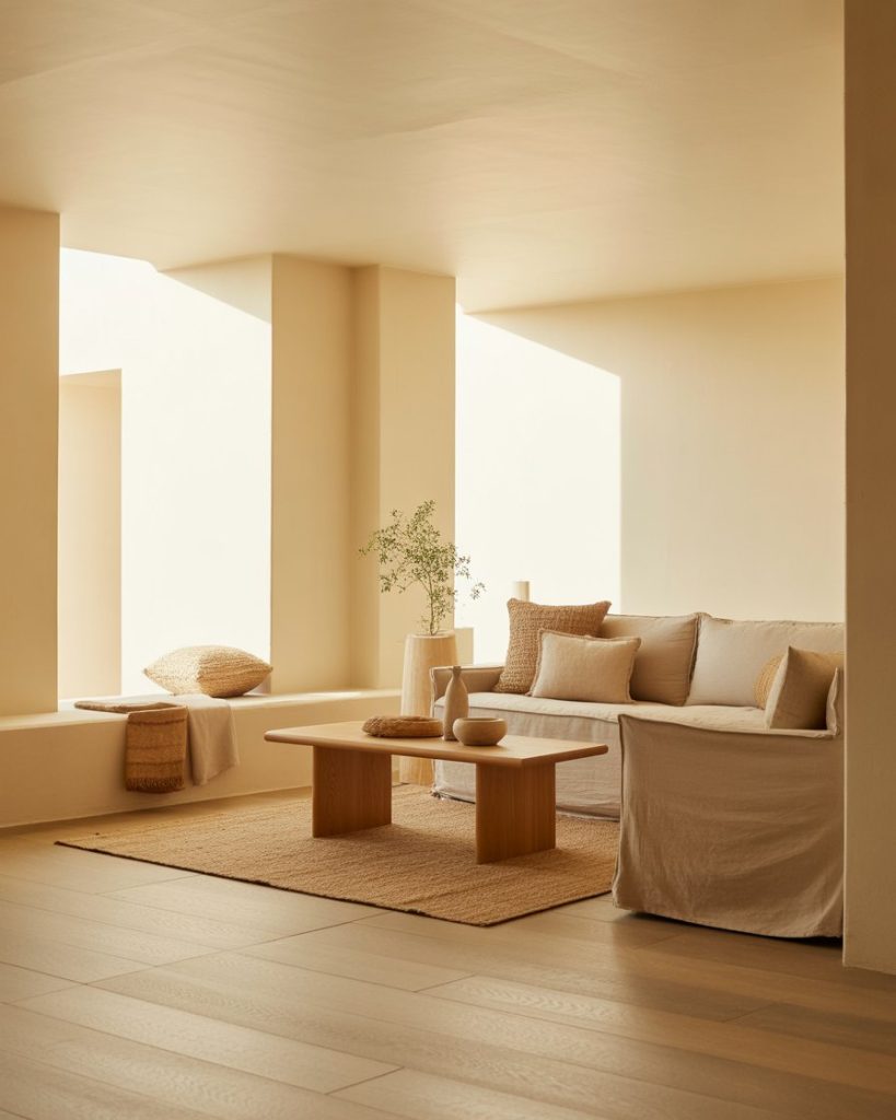 Palettes featuring neutral shades, such as white, sand, and soft grey, help to keep an environment feeling and looking airy, while spatial efficiency and peace are achieved through multi-functional pieces. This layout embodies peaceful simplicity — natural, uncluttered, and full of light.
