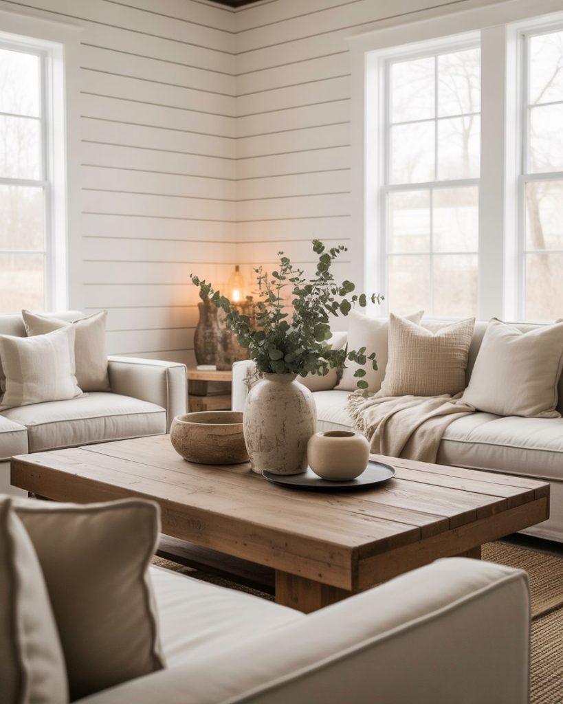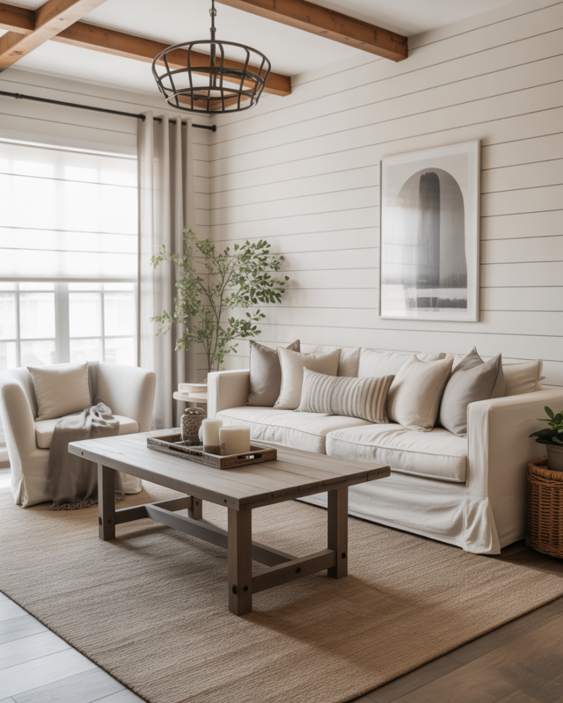 Modern farmhouse style combines rustic charm with contemporary comfort and remains a favorite through 2026. Think shiplap walls, oversized sofas, and neutral palettes with a splash of black accents. Wooden beams or salvaged coffee tables create a sense of grounded balance without overwhelming the room. It feels relaxed, timeless, and beautifully cozy.