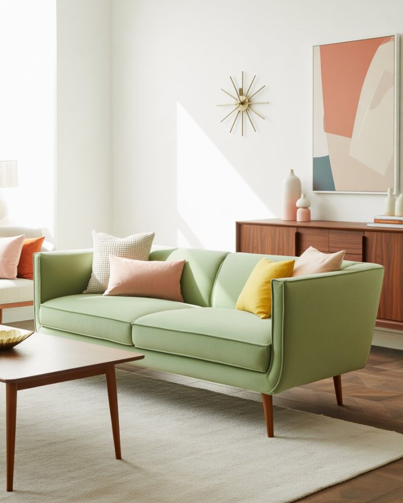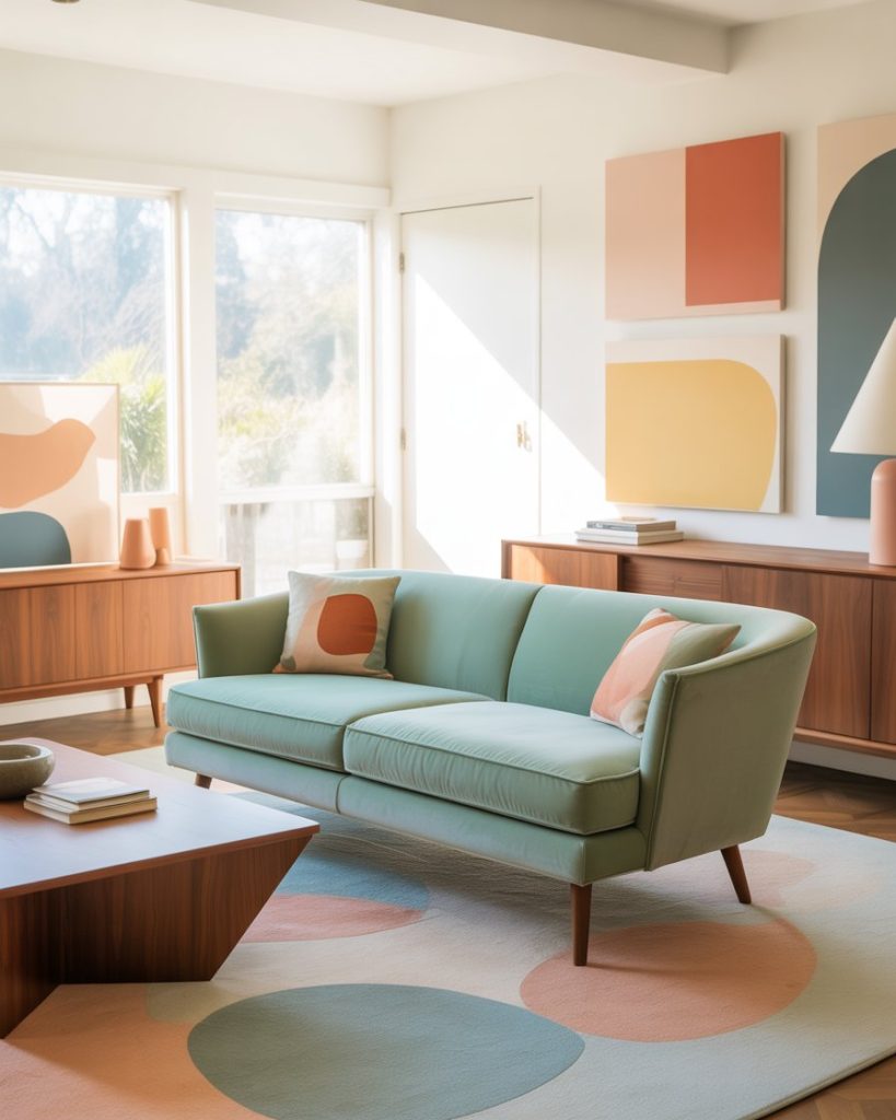 Midcentury design gets a playful 2026 update through pastel shades — mint green, blush pink, and sky blue. Combine these colors with wooden frames, clean lines, and geometric art. The result is bright and nostalgic, merging retro energy with a contemporary twist. It’s cheerful yet grown-up, ideal for creative homeowners.