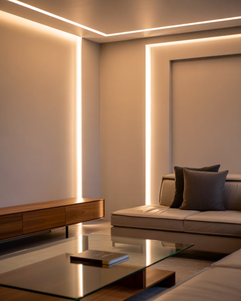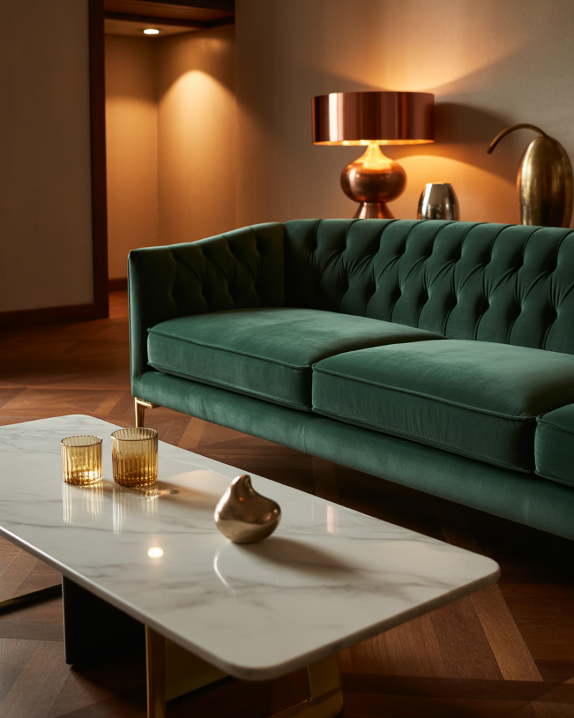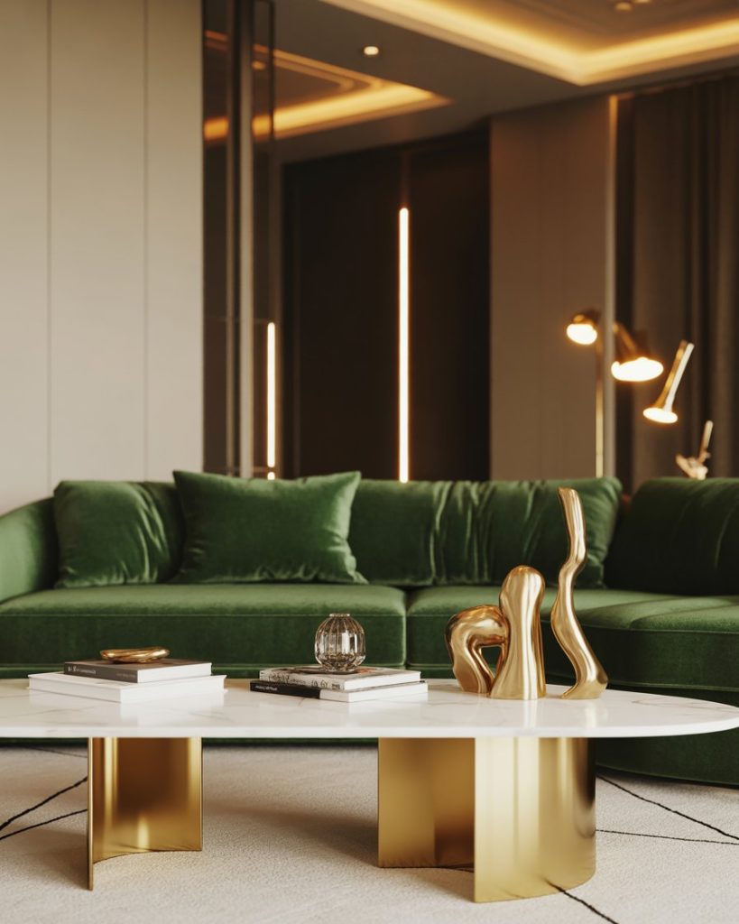 Combining luxury with contemporary sensibility, this idea turns your living room into a sanctuary of elegance. Think plush velvet sectionals, marble coffee tables, and sculptural lighting that doubles as art. Metallic finishes like brass or copper bring warmth, while soft textiles ensure it feels cozy and inviting. Interior design experts such as Kelly Wearstler often note that modern luxury is less about price and more about comfort that looks effortless.