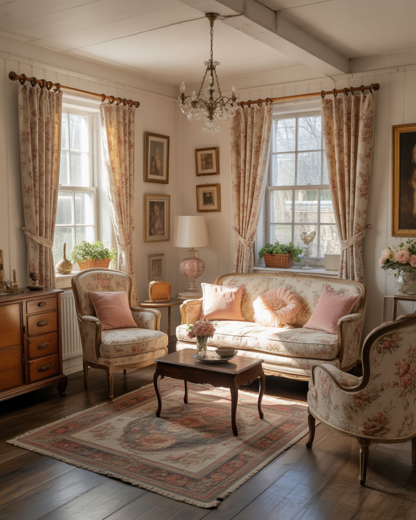 A vintage cottage living room offers nostalgic charm with soft fabrics, floral prints, and natural wood tones. Combine antique pieces with modern lighting for balance. Use a warm palette of cream, sage, and faded rose to evoke calm comfort. The atmosphere is homely and deeply cosy, perfect for quiet evenings.