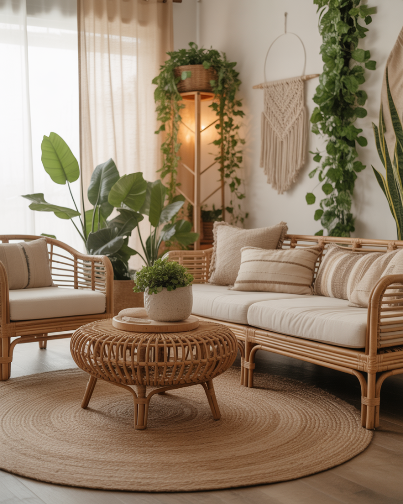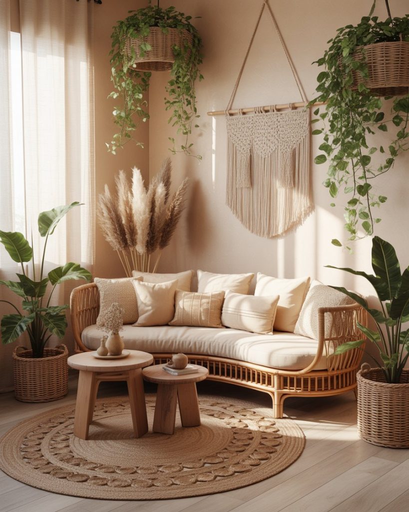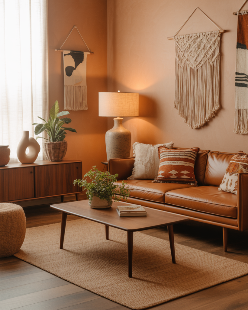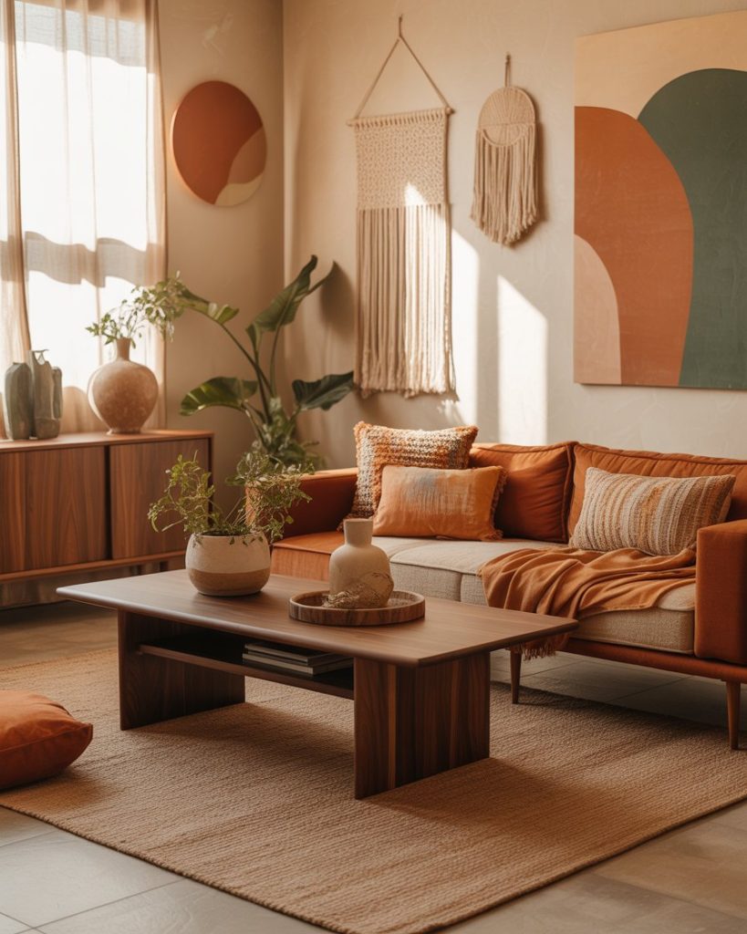 This boho direction embraces desert tones—terracotta, sand, and rust—balanced with organic fibers like cotton and jute. Cactus plants and handcrafted pottery add authenticity. Layer textiles for depth while keeping the layout open and breathable.