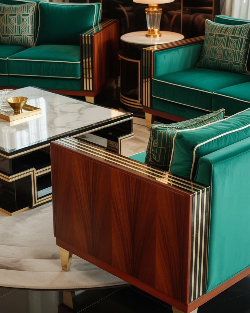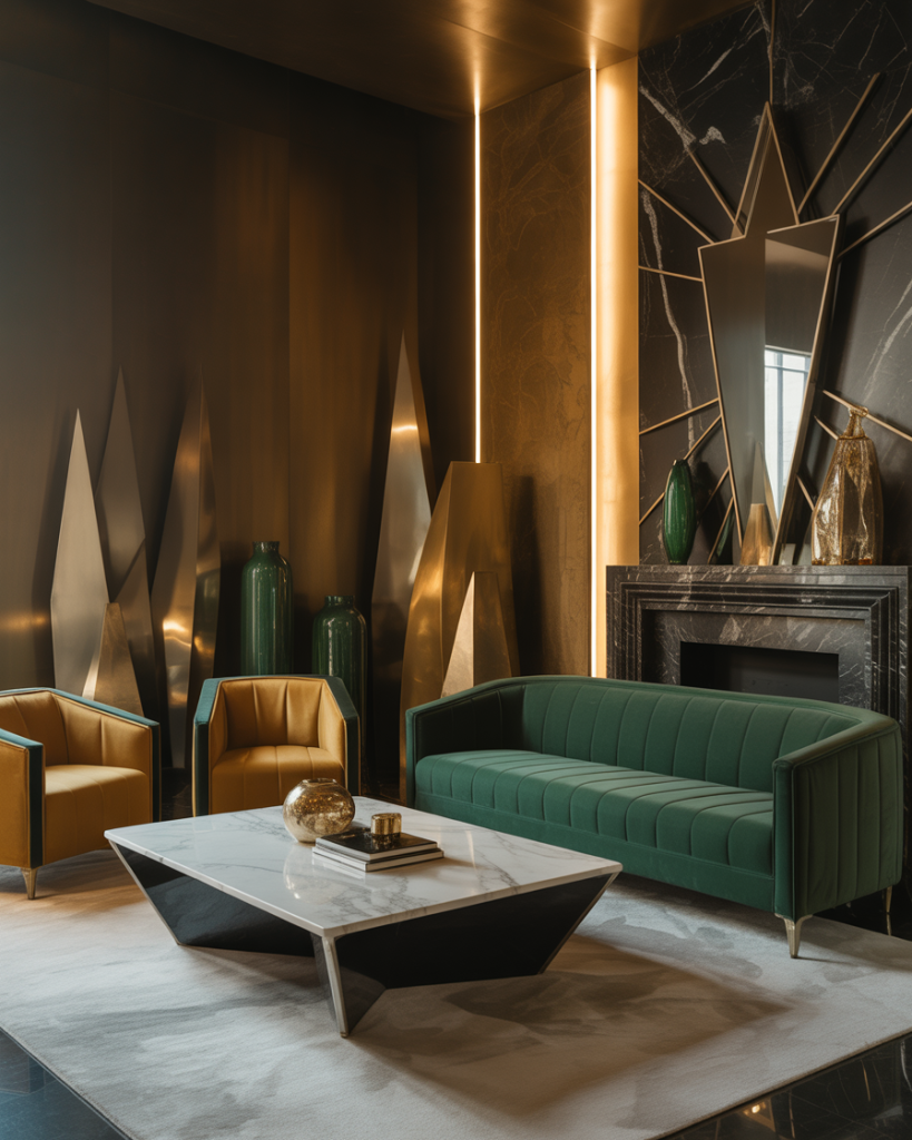 The revival of art deco interior design brings a sophisticated, geometric flair to 2026 living rooms. Think velvet chairs, brass frames, rounded mirrors, and marble side tables set against deep jewel tones like emerald or navy. [ID16]