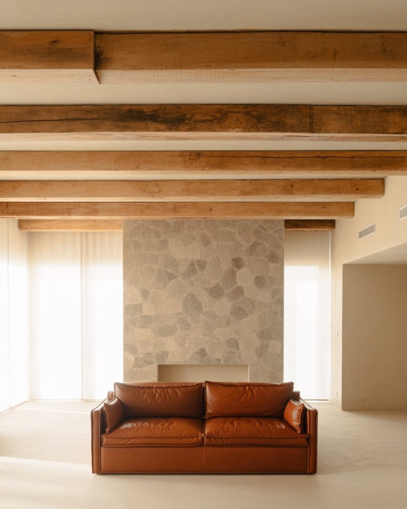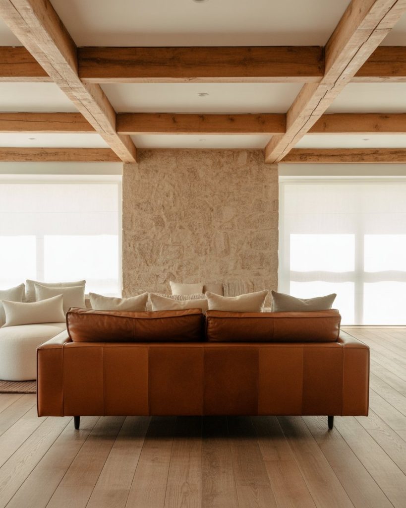 This concept combines rustic minimalist restraint. Exposed wood beams and stone details with leather and neutral fabric furniture is what creates a natural and uncluttered space. It is uncluttered not by lack of intention. Each piece is there for a reason. This results in a warm and cozy feeling, but simple and refreshing.