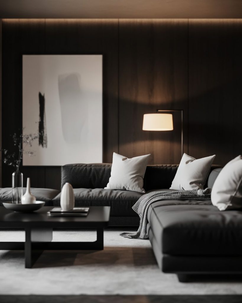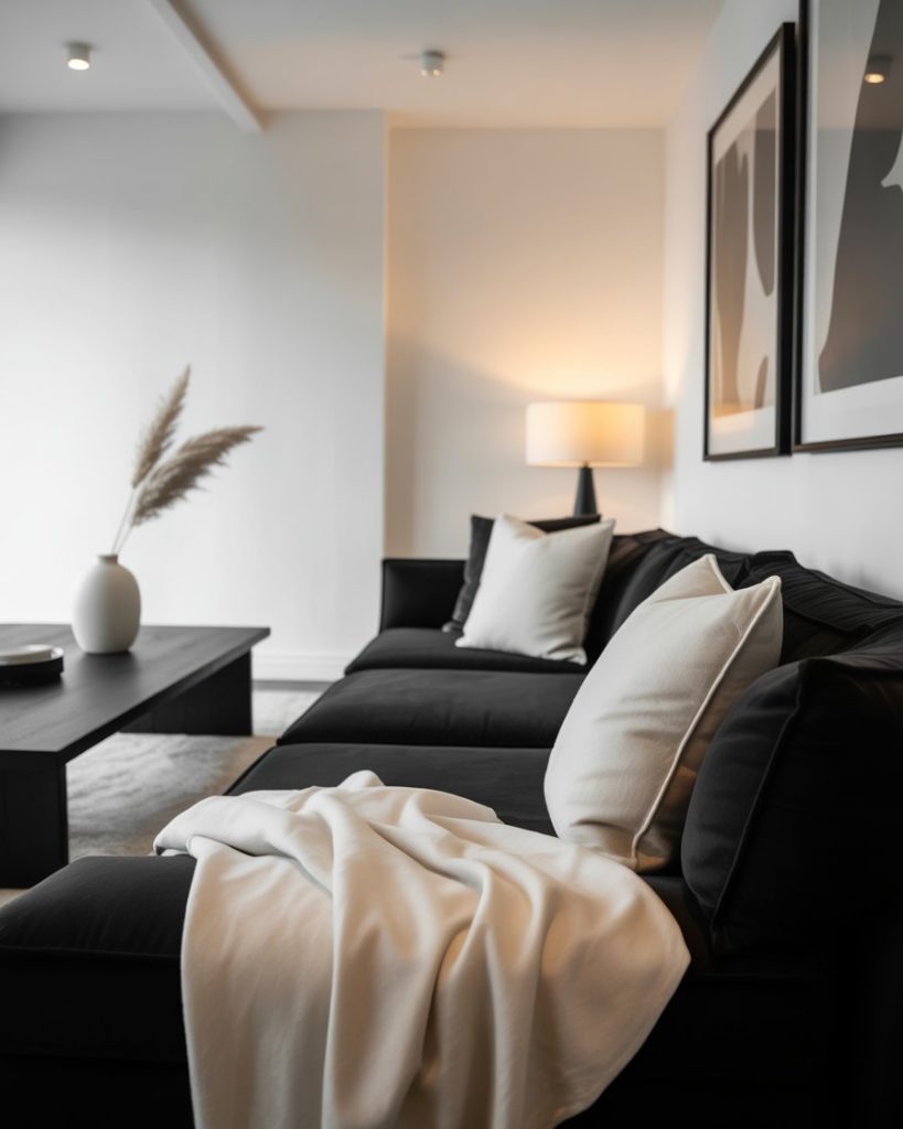 This idea turns the timeless black and white scheme into something sleek and comforting. Plush rugs, layered fabrics, and varied lighting soften the minimalist backdrop. Low sofas and bold artwork make it chic, while textures keep it cozy. The secret is in the mix — contrasting materials like linen, leather, and matte ceramics create quiet luxury without clutter.