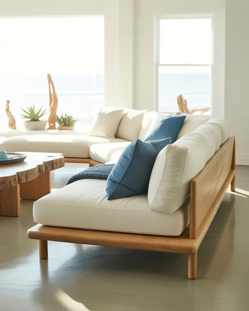 A coastal and contemporary combination gives your living room a breezy, relaxed spirit. White walls, pale woods, and linen upholstery capture the essence of seaside calm. Add woven light fixtures, soft blues, and airy drapes for a timeless, tranquil atmosphere. This design brings the serenity of the ocean to urban homes and open-plan apartments alike.