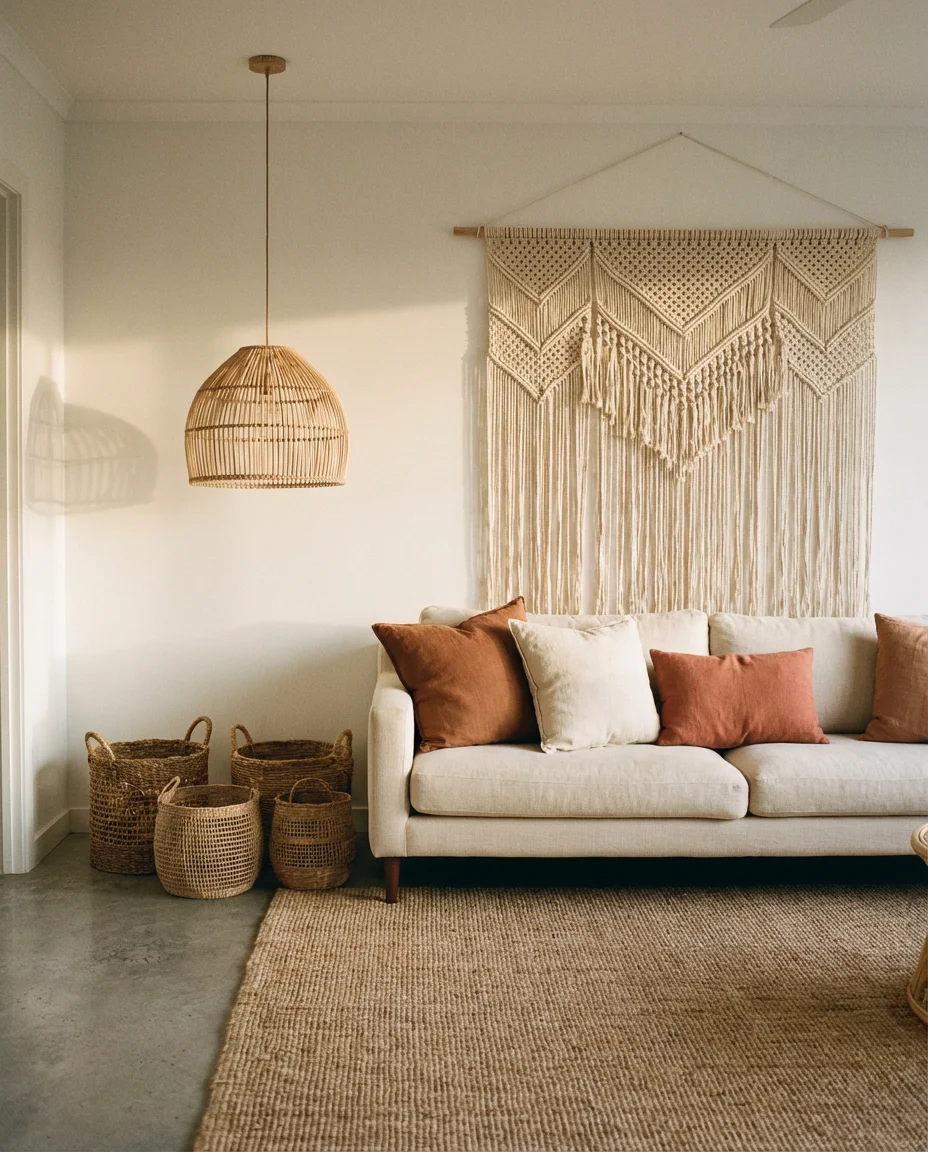 6. Boho Living Room with Macramé and Rattan