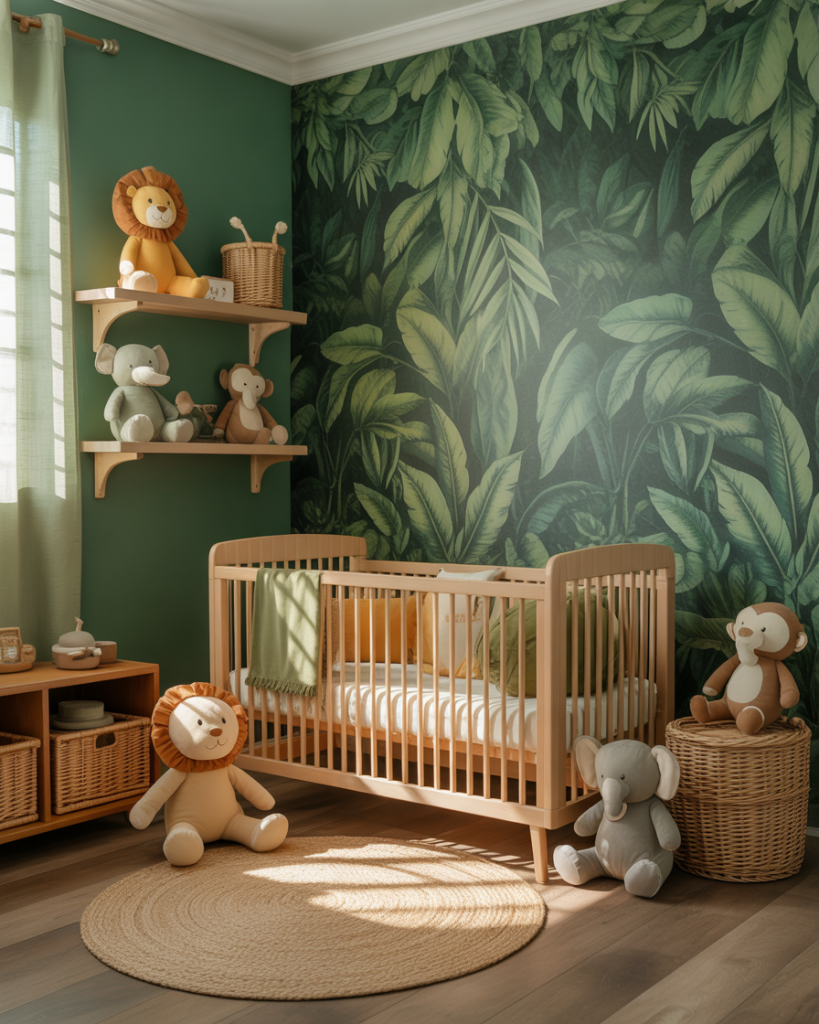 A nursery inspired by a forest or jungle is a great choice for parents who find joy in nature. Create a natural retreat with deep greens, leafy wallpaper, and wood furniture. Add plush animal toys and woven baskets for softness and contrast. One wall should stay light and open to promote a sense of dreaming and discovery.