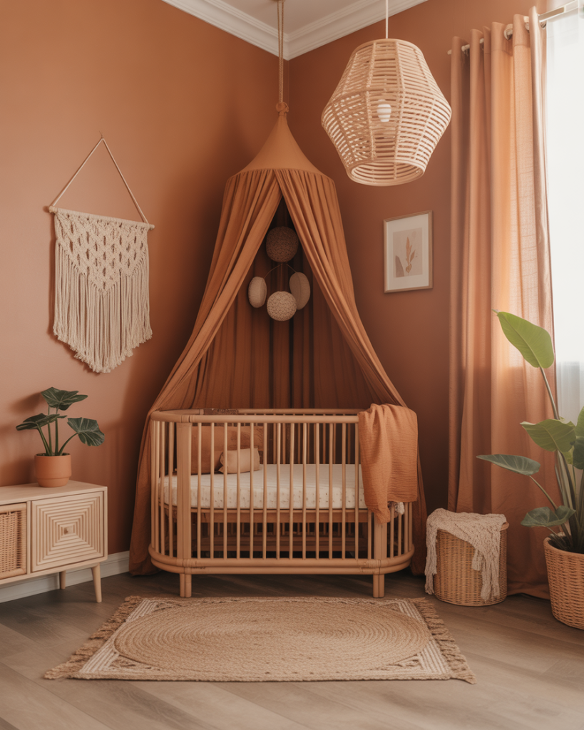 An earthy boho nursery uses a natural palette of clay, sand, olive, and terracotta. Create layers with rattan, macramé, cotton, and other natural materials. Use real or faux greenery for a calming touch. This design celebrates effortless, grounded style while promoting warm and meaningful sustainability for all modern families.