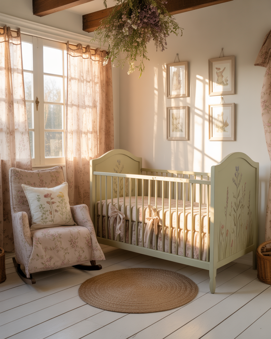 A cute cottage-inspired nursery blends vintage charm with modern comfort. Choose floral fabrics, lace details, and painted wood furniture. Soft blues, pinks, and creams bring gentle warmth, while a rocking chair and quilted blanket complete the look. It’s sentimental, calming, and full of personality—like Grandma’s hug in décor form.
