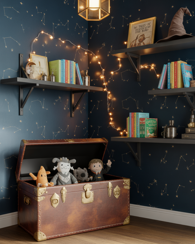 Imagine a Harry Potter nursery that includes starry wallpaper, vintage trunks, floating bookshelves, and warm lighting that is all inspired by Hogwarts. For parents who adore literature, this design will bring wonder and nostalgia. Subtle references to Harry Potter bring the magic to bedtime stories and ignite the spark of imagination.