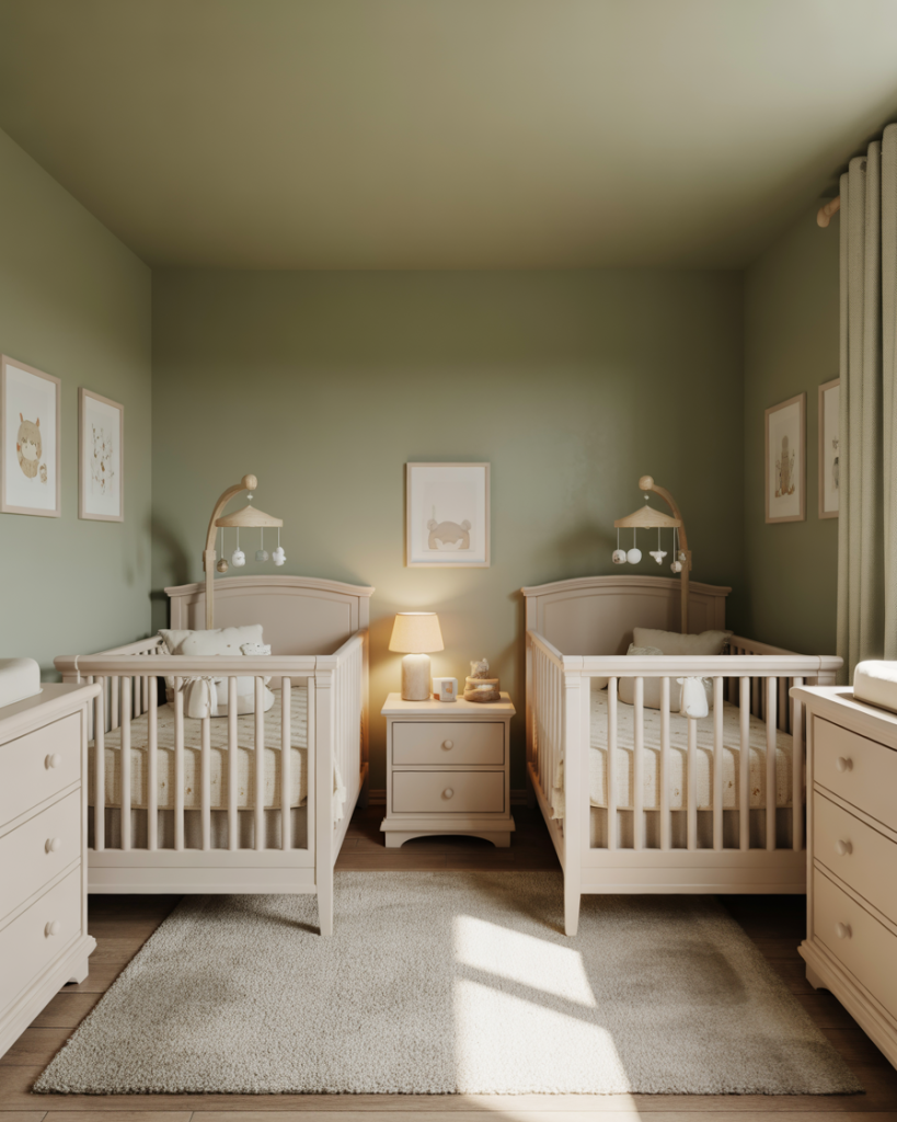 When designing for two, a twin nursery works best with symmetry and smart storage. Calm your space with soothing colors like soft green or beige. Create visual balance and order with matching bedding and mirrored artwork.