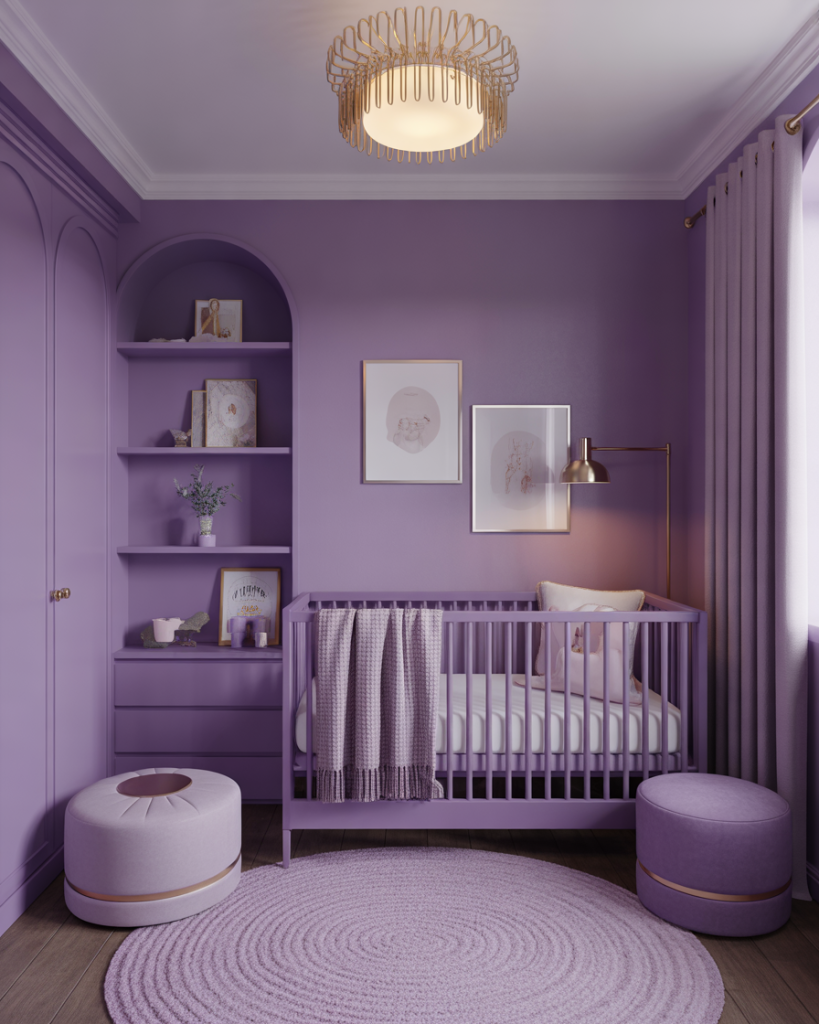 A soft purple palette—from lavender to mauve—sets a soothing yet sophisticated tone. Pair it with metallic touches like brushed gold or silver for a subtle glow. Add plush textures to elevate the coziness. This color brings both calm and charm, fitting for any modern nursery.