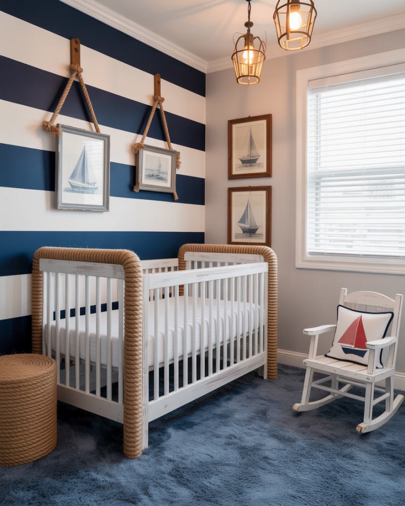 Bring seaside calm into your baby’s room with a nautical theme. Think navy blue stripes, rope accents, whitewashed wood, and anchor details. A few brass touches or framed sailboat prints add polish, while soft blue and cream bedding keeps the look cozy. It’s fresh, breezy, and perfectly suited for coastal or lake-inspired homes.