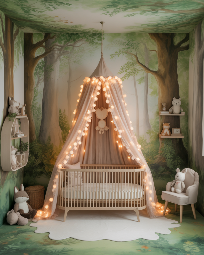 If imagination is your design goal, a whimsical fairytale nursery creates pure magic. Think twinkling string lights, soft tulle canopies, and enchanted forest murals. Woodland animals, fairies, or mushrooms can appear subtly in décor for charm without kitsch. It’s a dreamy hideaway that grows with your child.