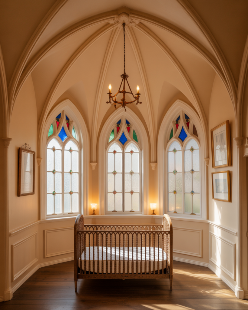For families who appreciate tradition, a church-inspired nursery evokes peace and symbolism. Use arched details, stained-glass patterns, and soft candlelight hues like ivory and gold. Incorporate antique-style frames or a wooden cross if desired. The result is reverent yet comforting—a timeless sanctuary for your baby.