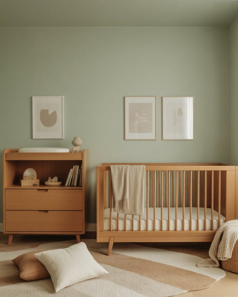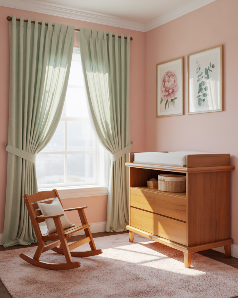 Soft pink paired with muted green brings gentle sophistication to a nursery. It’s not overly feminine—just warm, soothing, and organic. Think blush walls, sage curtains, and floral art. Add wooden accents to create balance and natural warmth. This combo feels fresh, elegant, and easy to update as your child grows.