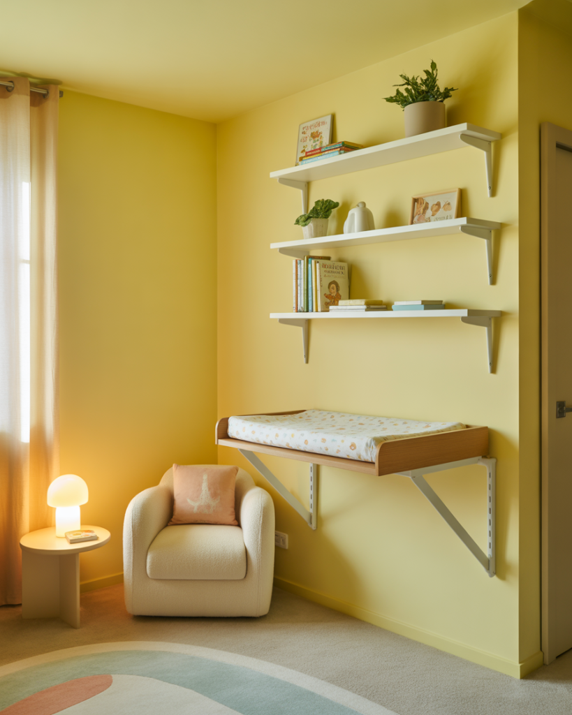 Smart design choices give the feeling of spaciousness to even the tiniest nursery. To maximize every inch, you can use floating shelves, fold-down changing tables, and vertical storage. For the best effect, use light colors, such as pale yellow or white, and one statement piece—a bold rug or soft floating canopy, which adds comfort and charm.