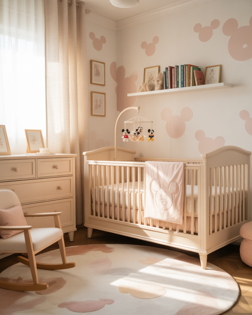 A unisex nursery inspired by Disney classics brings gentle nostalgia without overwhelming the space. Choose subtle character motifs—maybe Winnie or Mickey—in muted tones of cream, blush, and gold. Blend these with neutral furniture and simple linens for a room that feels timeless and charming rather than cartoonish.